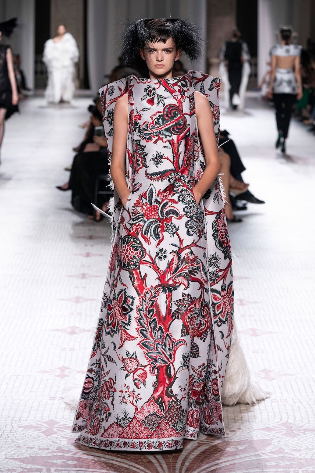 Отсюда в коллекции — пышные платья со сложными драпировками, благородные кейпы лавандового оттенка, огромные серьги-люстры, длинные юбки-колонны и богато расшитые кимоно, напоминающие стены, шторы и ширмы в королевских интерьерах.