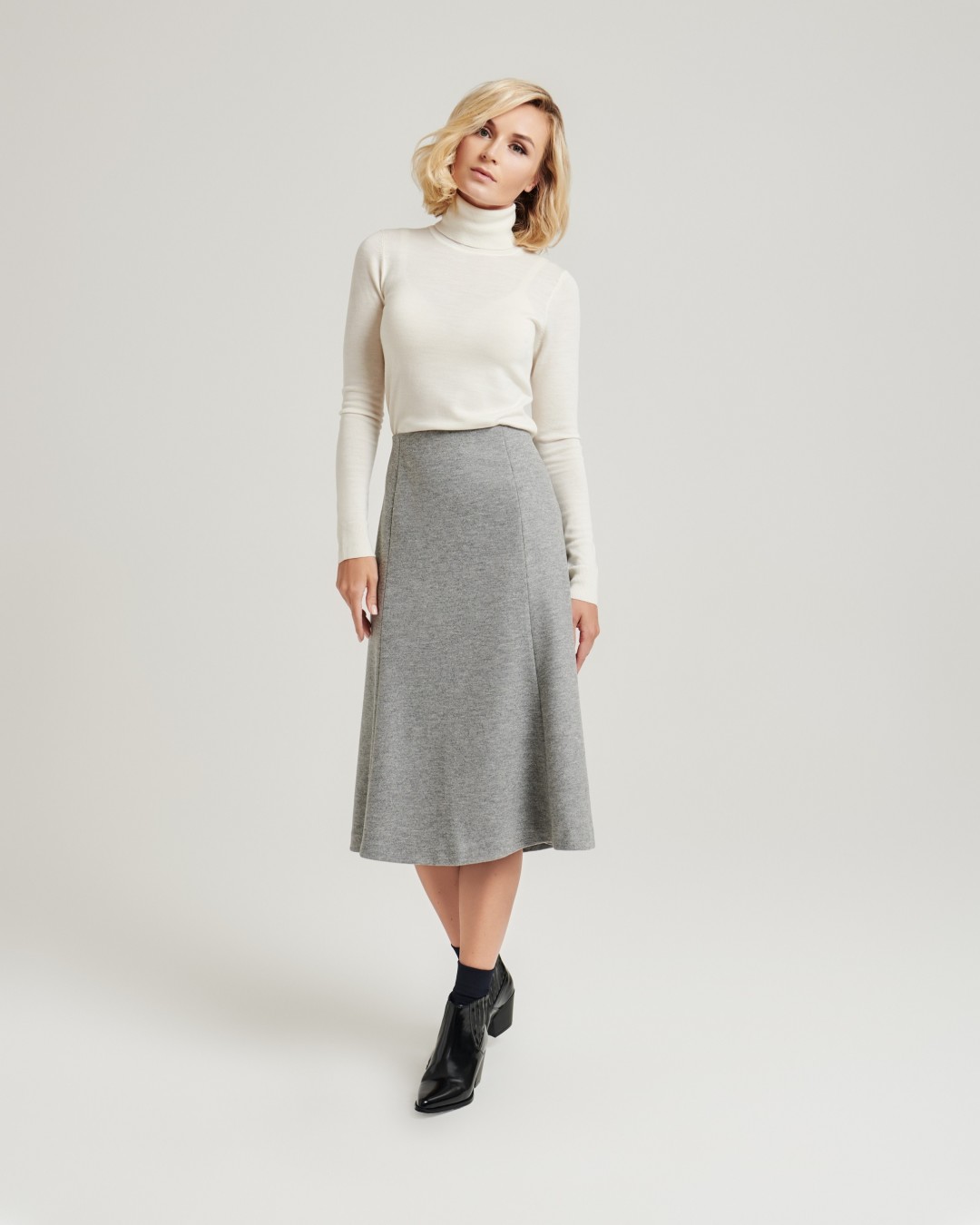 Бесшовное пальто меняет представление о теплой одежде. Благодаря высокофункциональным материалам, оно обеспечивает двойную защиту от дождя и снега. Светлана Ходченкова выбрала модель серого цвета в сочетании с джемпером с круглым вырезом и утепленной ветрозащитной юбкой.