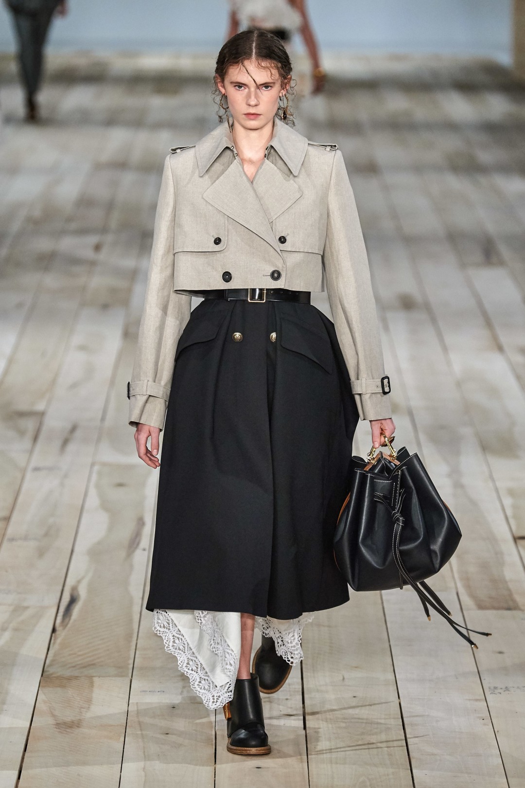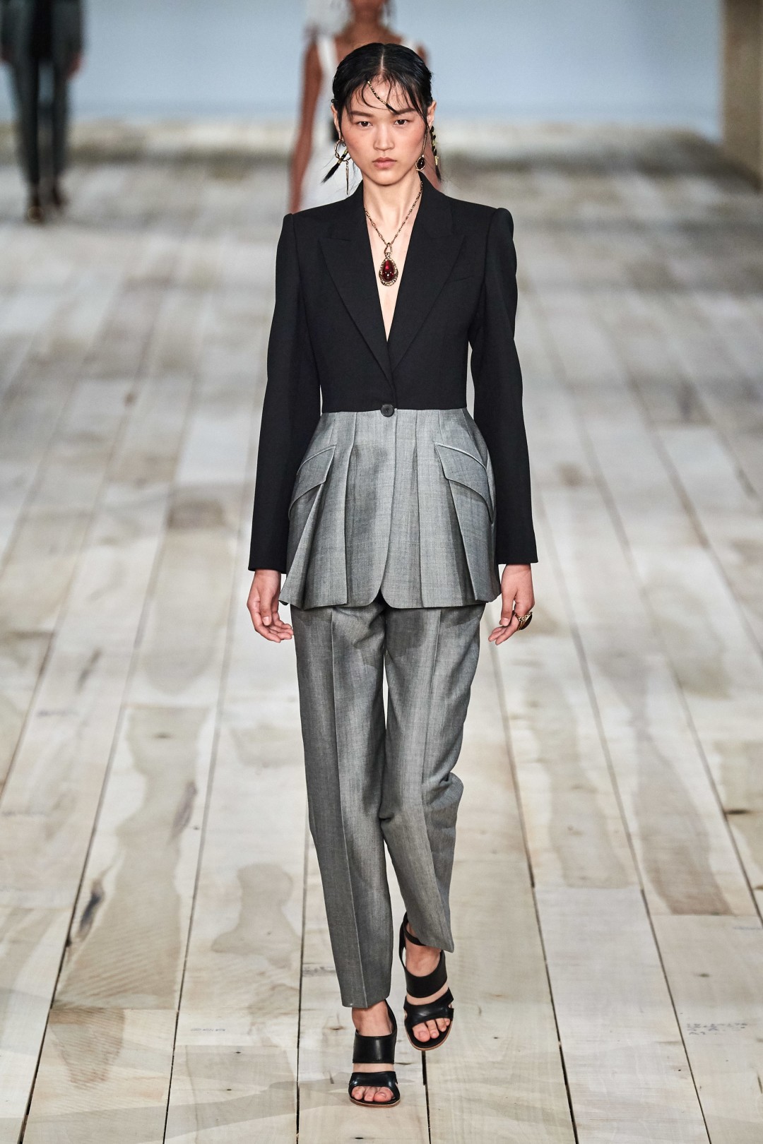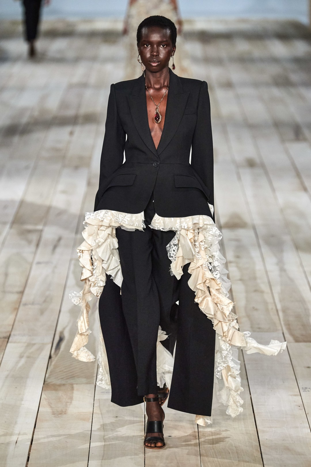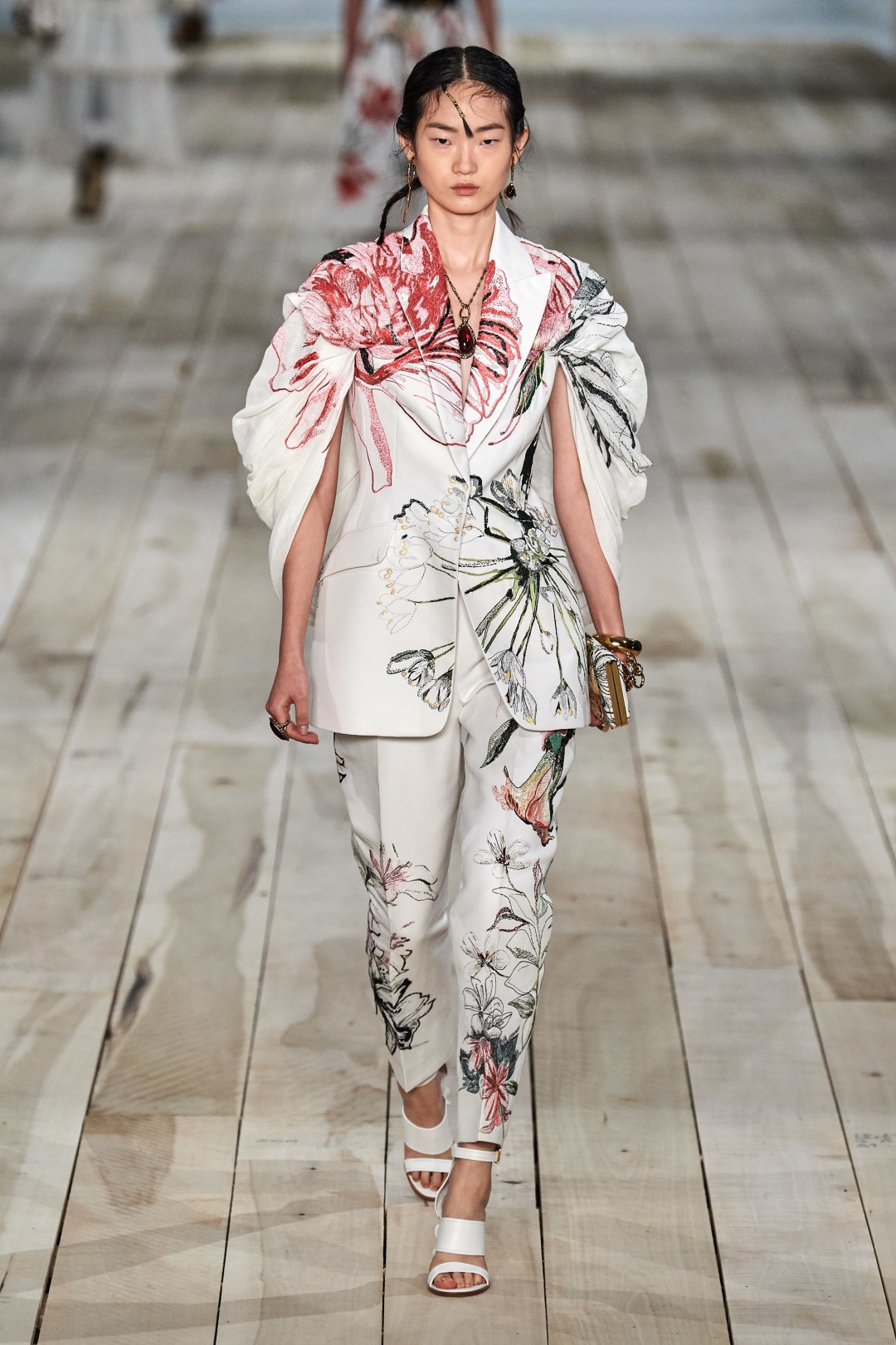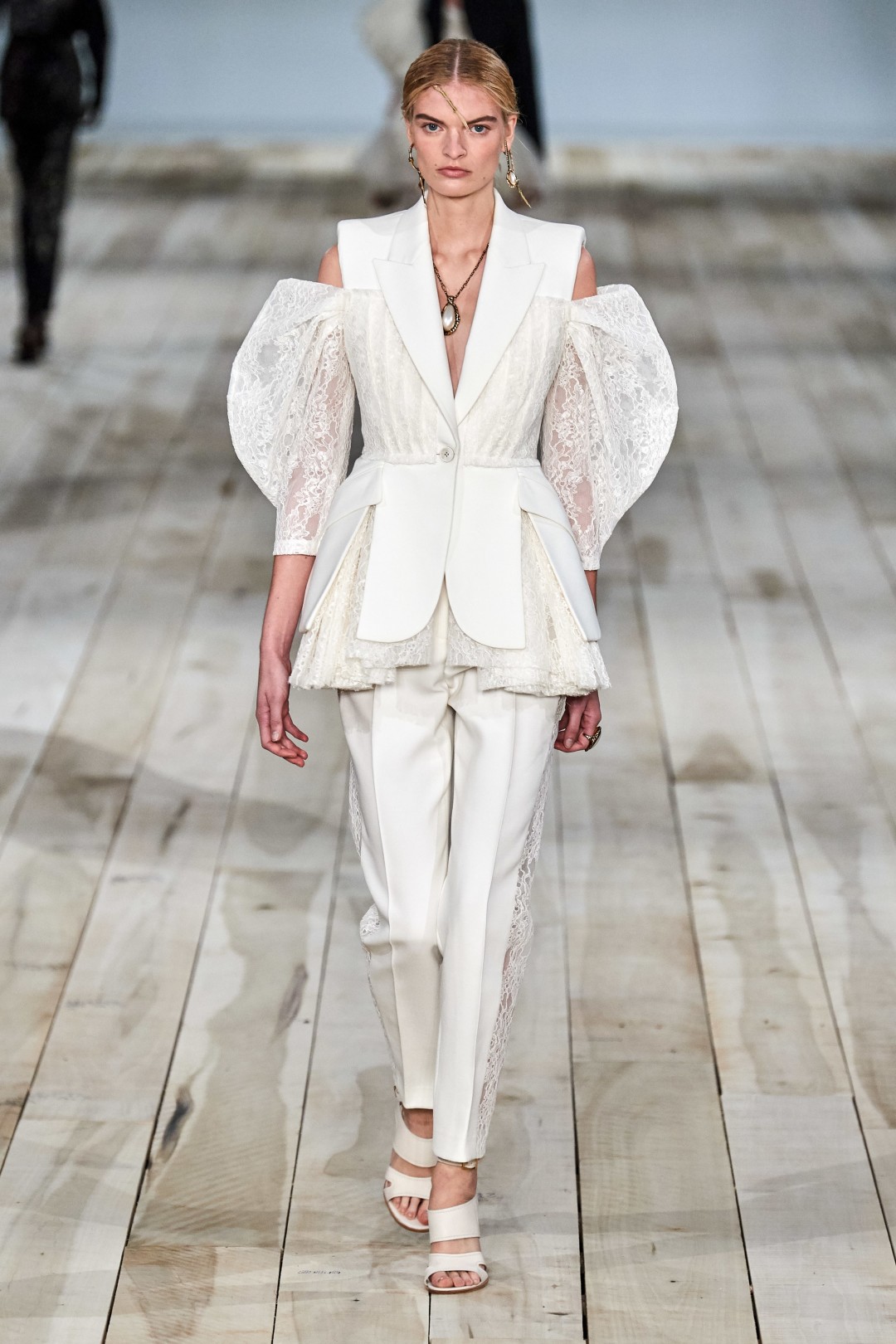 Также в коллекцию вошли вещи из кружева, органзы и тюля, взятые креативным директором Сарой Бертон из коллекций предыдущих сезонов. Из переработанных материалов сделан в том числе асимметричный наряд с многочисленными рюшами, отсылающий к знаменитому платью-«устрице» Александра Маккуина 2003 года выпуска. Часть новинок выполнена из светлого льна, выращенного на небольшой ферме в Северной Ирландии, и дамаста, создание которого в Ирландии считается почти исчезающим ремеслом. Чтобы подчеркнуть тот ручной труд, с которым была создана весенне-летняя коллекция, Сара Бертон вышла на поклон с сотрудниками модного дома, в том числе охранником и CEO.