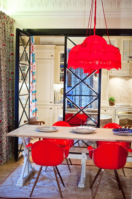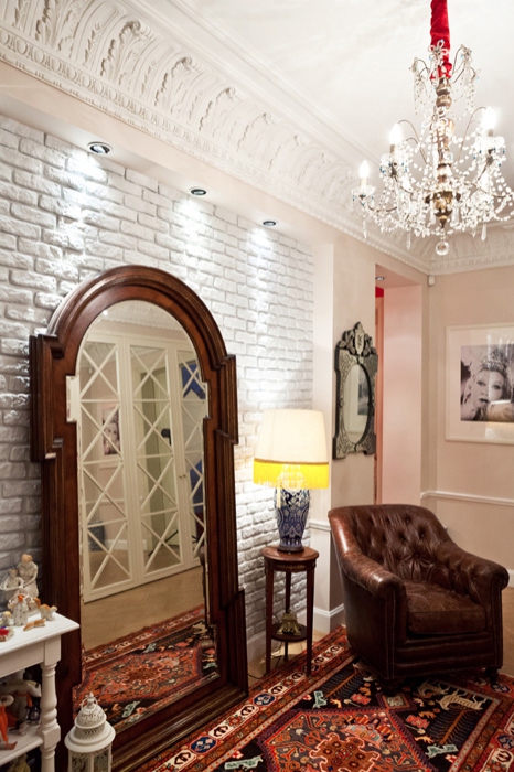 Вкусы заказчика и дизайнера совпали, и последний чувствовал себя абсолютно свободно, миксуя подсвечник из IKEA с часами эпохи Наполеона, совмещая зеркало из дома, в котором жила Фаина Раневская, с найденной в Интернете и увеличенной фотографией Любови Орловой, ставя современное, искусственно состаренное кожаное кресло на столетний бакинский ковер ручной работы или разыскивая уникальные подсвечники на европейских блошиных рынках, а дореволюционные утюги — в глухих русских деревнях. Антикварные хрустальные люстры, приобретенные в московской мастерской Кати Гердт, идеально подошли к старинной лепнине, сохранившейся в квартире и лишь слегка отреставрированной. В перекрещенных на потолке факелах и кистях Александр видит символы работы и победы: если много трудишься, победа будет у тебя в руках. Получившийся в итоге стиль он называет эклектичным: здесь квартиры старой московской интеллигенции из фильмов 1960-х годов встретились с солидными американскими домами во вкусе 1980-х и парижскими апартаментами конца XIX века. Результат более чем устраивает хозяев, которым тут удобно и уютно. А артист-дизайнер регулярно заглядывает в гости, каждый раз добавляя в интерьер очередную интересную вещь.