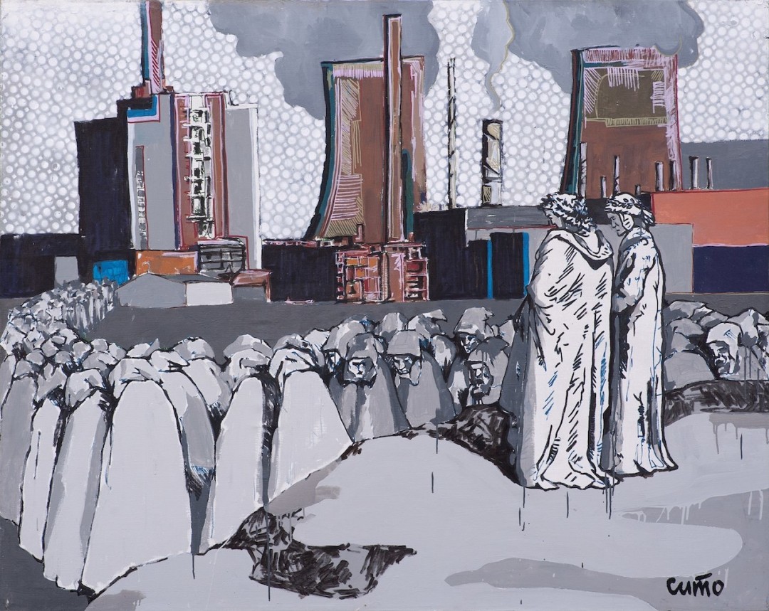 После — сосредоточились на станковой живописи, работе в мастерской. В проекте «Вергилий показывает Данте современный мир» совмещали уже знакомые сюжеты классических иллюстраций «Божественной комедии» с современными фонами старых городов, заводских окраин — такой постмодернистский коллаж. Если бы Данте попал в современный мир, он мог бы показаться ему адом. Шум, машины, сумасшедший ритм — такое масштабное изменение.