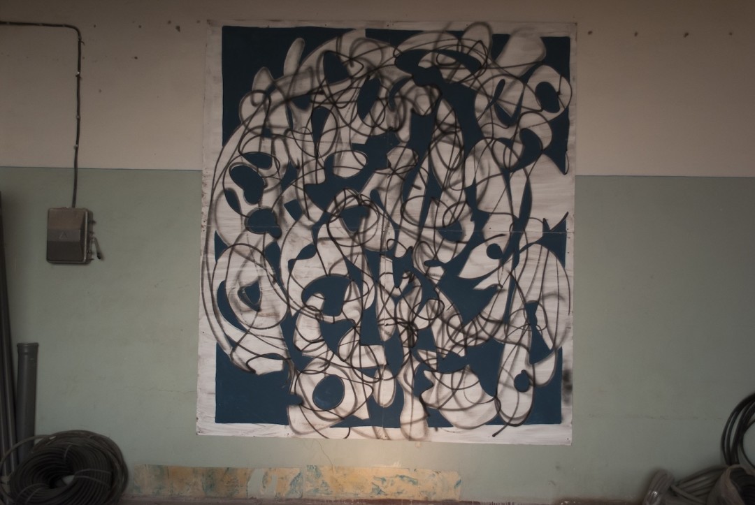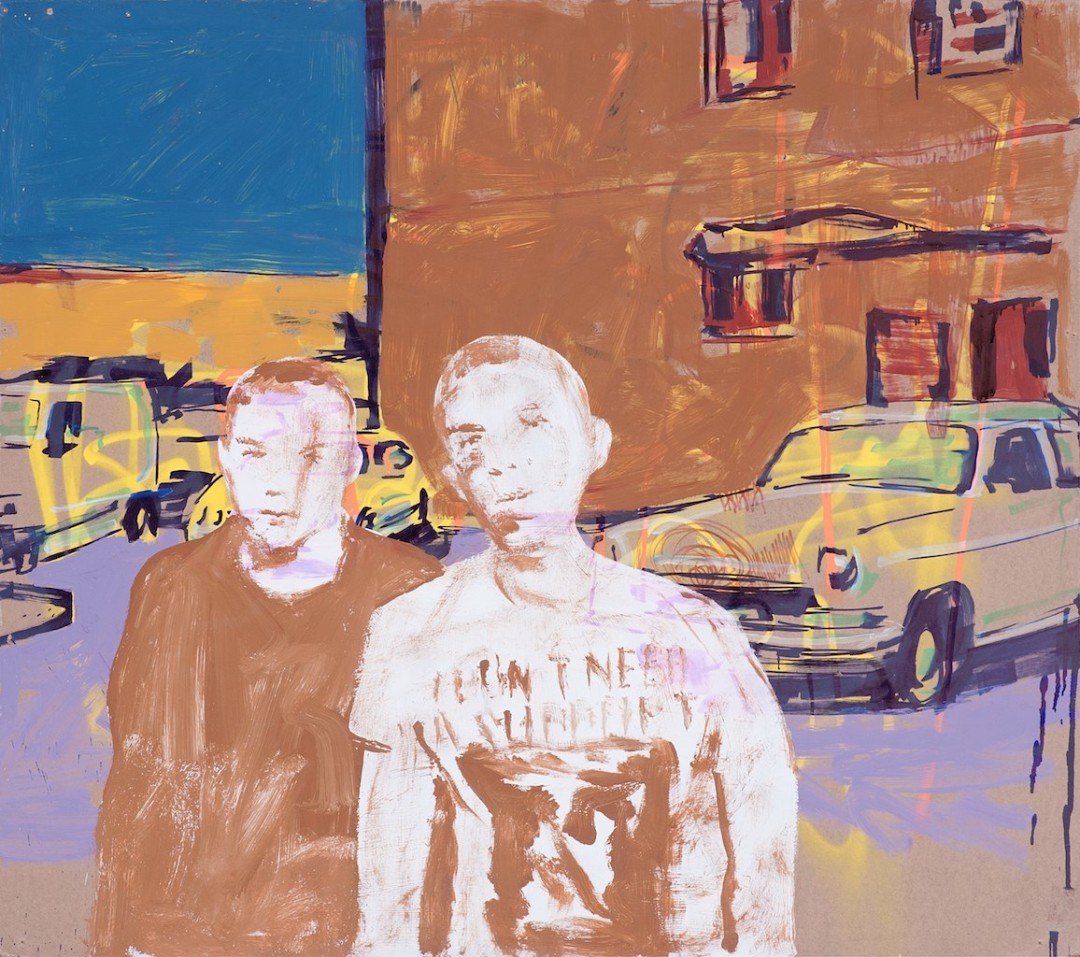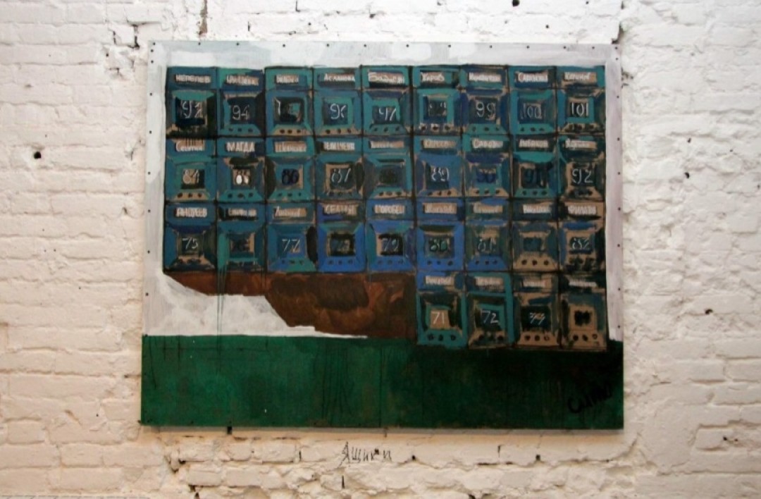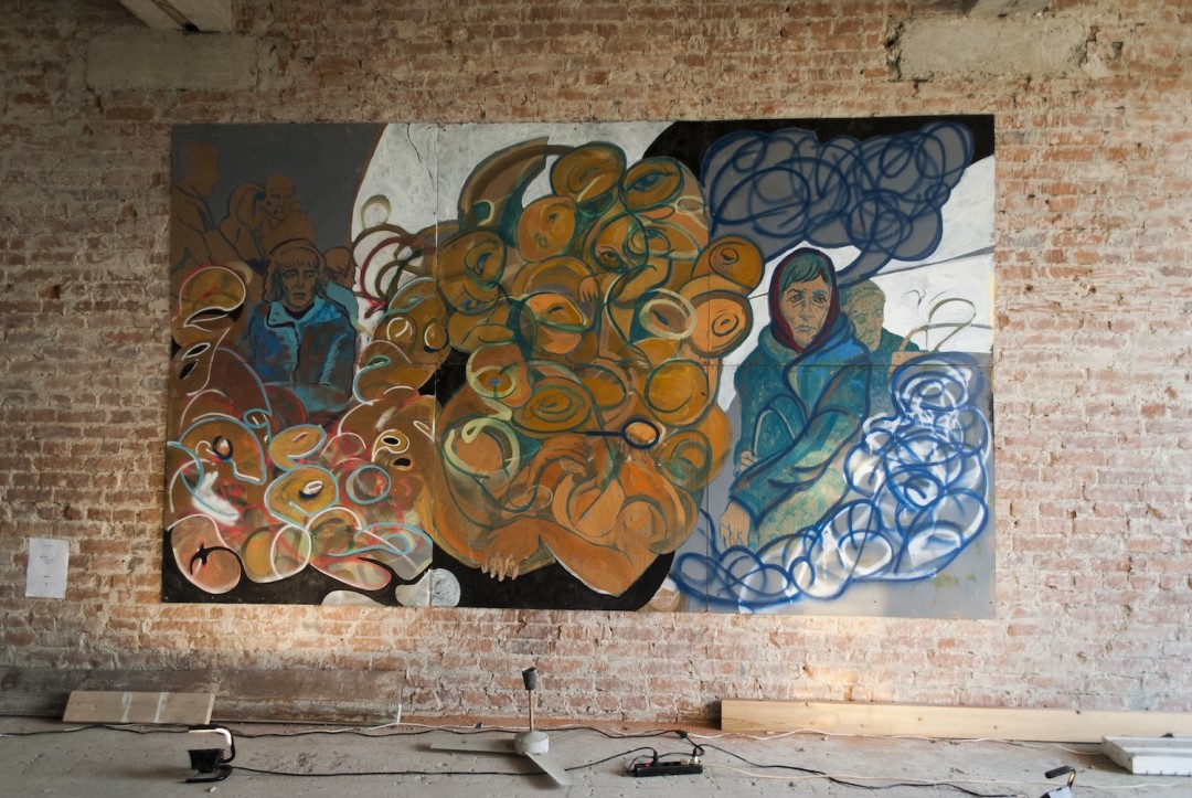 Несколько выставок делали во дворе клуба Cuba Libre (для нас это было культовое место). В 2012–2013 гг. состоялась первая выставка в «Макаронке», которая называлась «Протокол одной прогулки». Она была посвящена дому-гиганту 1925 года постройки, расположенному на Профсоюзной, возле памятника Стачке 1902 года. Это один из домов-коммун советского утопического проекта. Я провел там детство. «Протокол одной прогулки» включал около 30 масштабных живописных и одну видеоработу. Мы взяли фактуры дома (надписи, граффити, текстуры стен, найденную ветошь) и сделали коллаж из значимых образов, составили портрет воспоминаний об окрестностях.