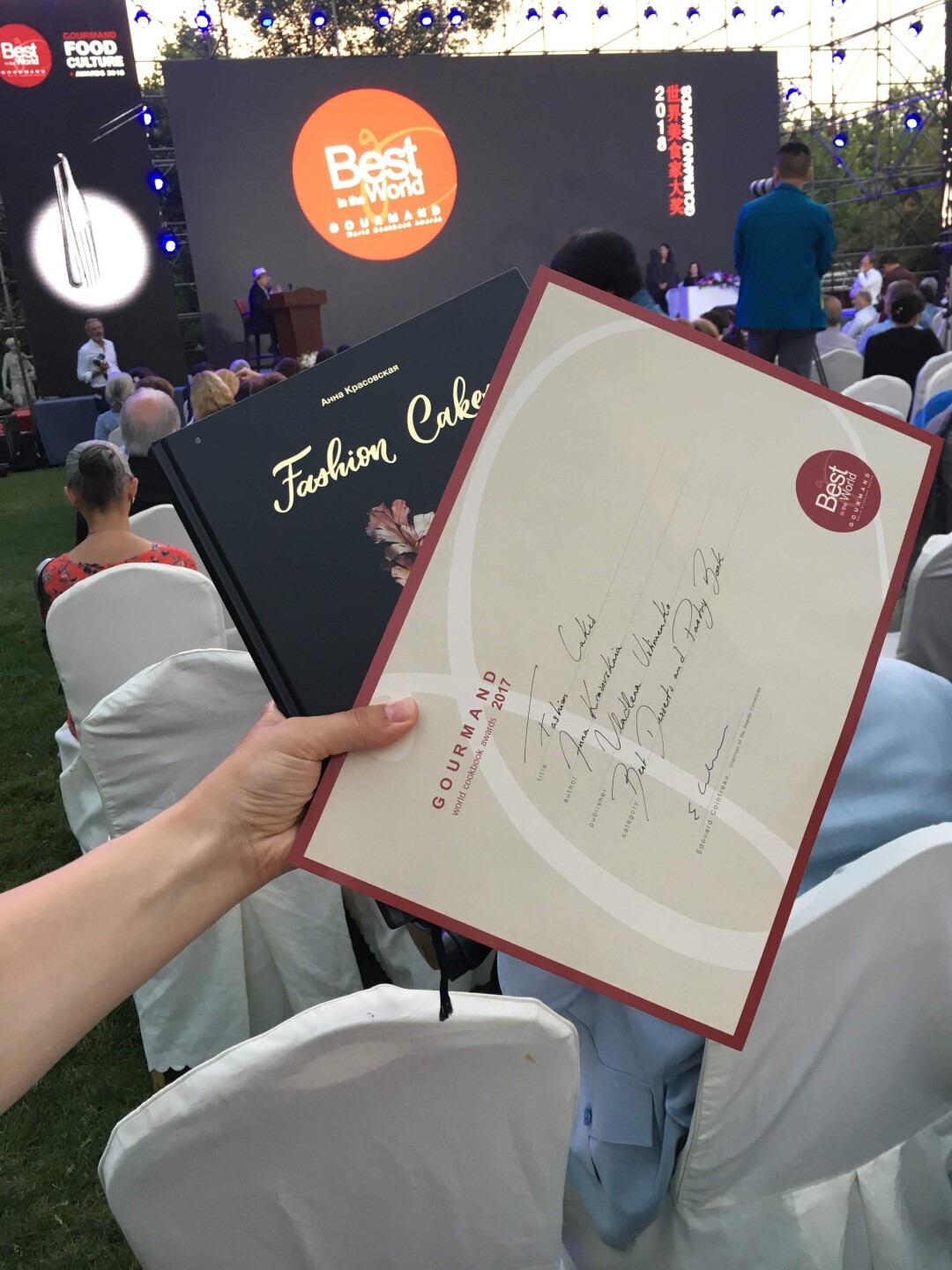 Приехав на церемонию, мы не питали никаких надежд: были десятки потрясающих книг из Норвегии, Германии, Англии, Америки, Японии, а от России — только мы. И, конечно, я была удивлена и очень рада, что Fashion Cakes признали лучшей кондитерской книгой 2017, а в 2020-м Gourmand Cookbook Awards включили ее в список лучших кулинарных книг мира, выпущенных за последние 25 лет. Она даже была выставлена в здании штаб-квартиры ЮНЕСКО.