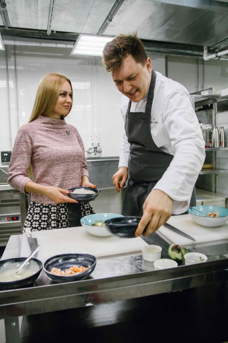 Александр с очаровательной Олесей Антоновой, владелицей студии одежды FitsHouse, приготовили на настоящей кухне три необычных и абсолютно разных блюда из одного главного ингредиента — рака.