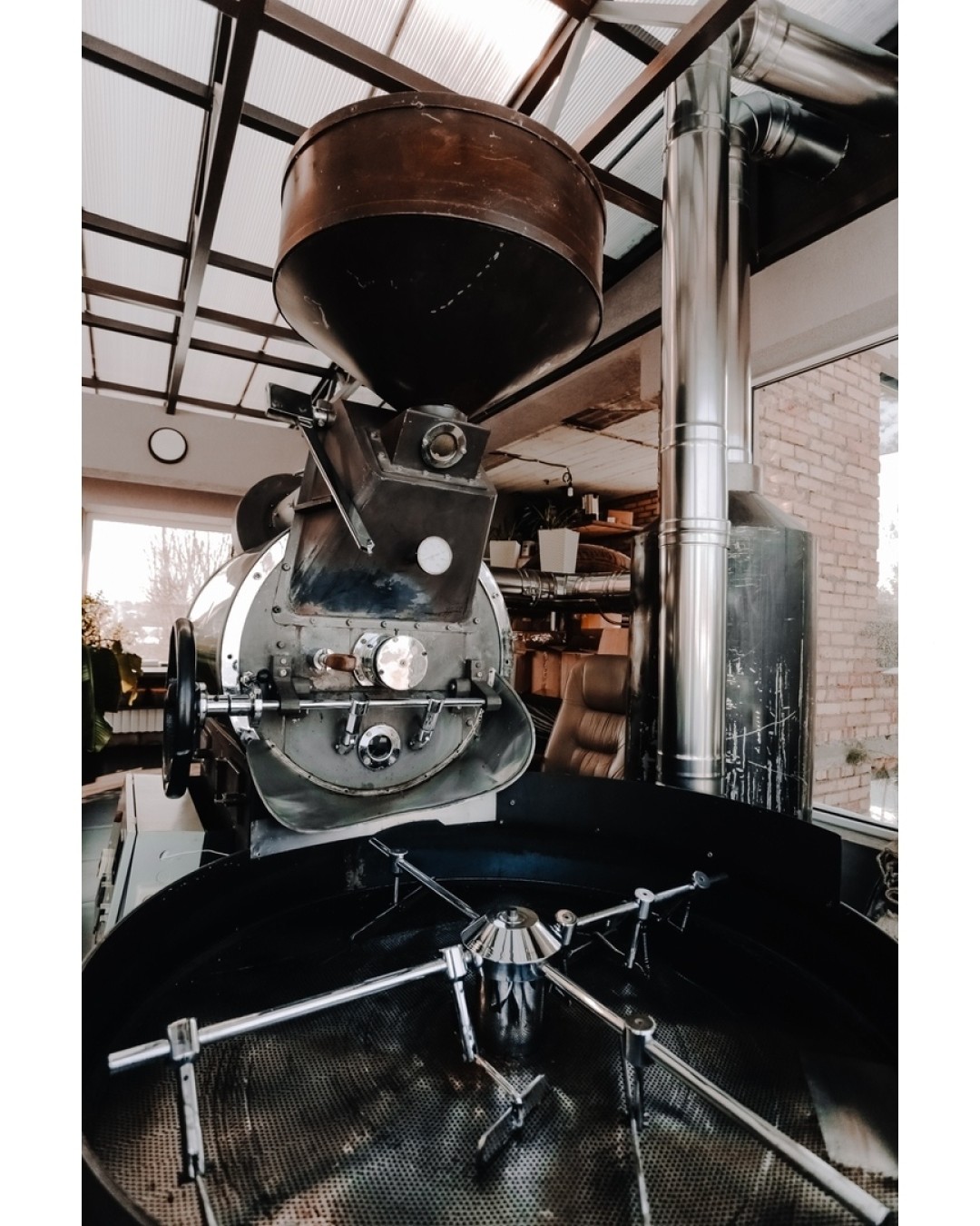 Создатель ростера сделал всего две таких машины. Одна из них - для выпекания сдобы. Он хотел сделать идеальную кофейню, где все было бы собственного производства. Ростер-ветеран чудом достался друзьям Настасьи Катковой, а потом попал в UCO Coffee.