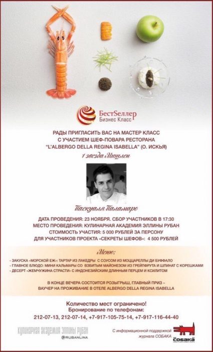 23 ноября у самарцев есть шанс приобщиться к тайнам мишленовской кухни. Совместный проект туристической компании БестSеллер Бизнес Класс и Кулинарной Академии Эллины Рубан «Секреты шефов» выходит на новый уровень. Обладатель звезды Мишлен – шеф Паскауль Паламаро (ресторан Indaco, отель Albergo della Regina Isabella, о. Искья) прибывает в Самару , чтобы дать урок итальянской кухни с средиземноморским акцентом.