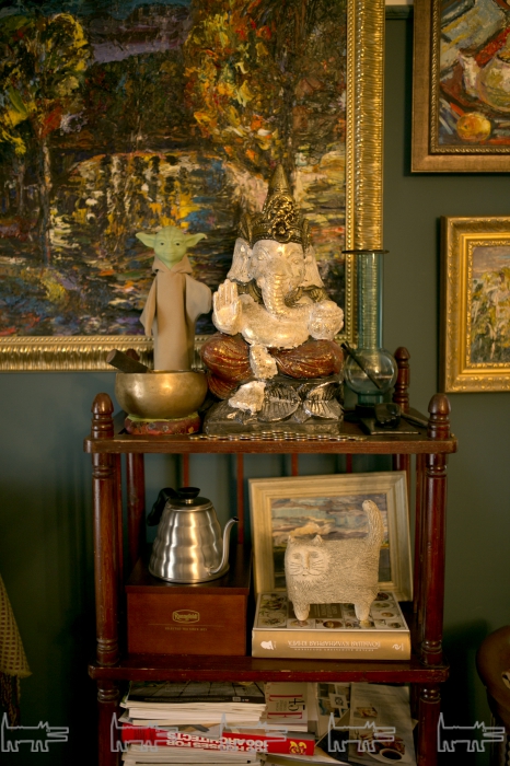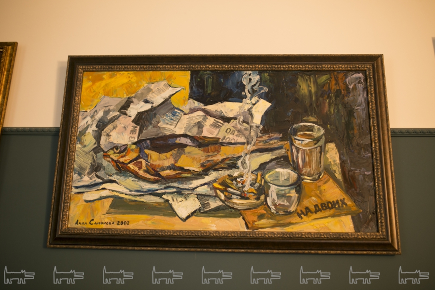 В интерьере сразу же бросается в глаза множество картин, висящих на стенах или аккуратно составленных в отдельном уголке. Все работы принадлежат руке художницы Анны Сливковой, жены Евгения, и продаются тут же. Теперь прикоснуться к прекрасному можно, попивая чашечку кофе, сваренного на песке. Кстати, все картины Анны Сливковой можно приобрести на art-most.com.