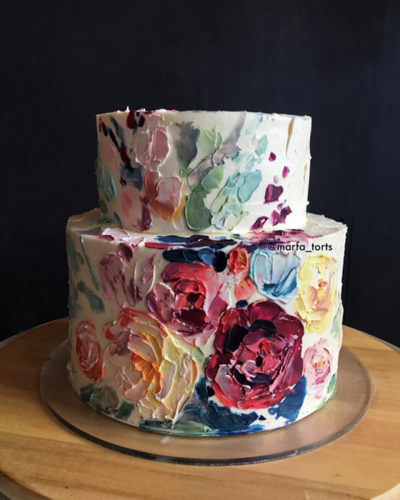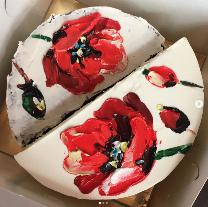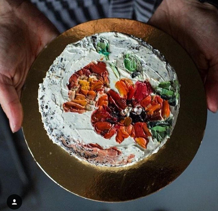 В ассортименте тортов — фирменный черёмуховый, ягодный, маково-лимонный, лавандовый из рисовой и тапиоковой муки, бри — в его начинке мусс из этого сыра и карамельные груши. Дизайн тоже можно выбрать самостоятельно — абстракцию, цветы, рисунок по фотографии кроме портретов и роспись по мотивам полотен великих художников. На создание одного торта до семи часов: сначала отпекаются бисквиты, делаются начинки и крема. После того, как торт собран, начинается роспись. Художница говорит, что чаще всего ее спрашивают о том, как можно получить такие цвета из варенья — однако для съедобных картин используются итальянские пищевые красители.
