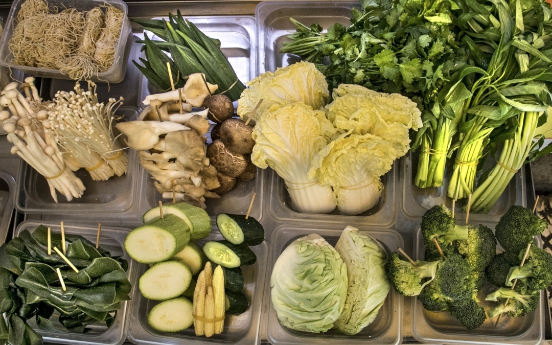 Овощи, грибы и салаты на прилавке лапшичной