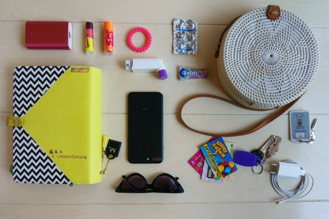 Начнем с сумки. Мне привезли ее с Бали друзья, они знают мой вкус. Очень люблю соломенные сумки, у меня их несколько, разных цветов, эта одна из моих любимых, в нее помещается все. Всегда у меня с собой Power Bank. Очень часто садится телефон, и если нечем зарядить, то это катастрофа. Есть всегда зарядка, бланк. С детства у меня астма, поэтому всегда с собой лекарство.