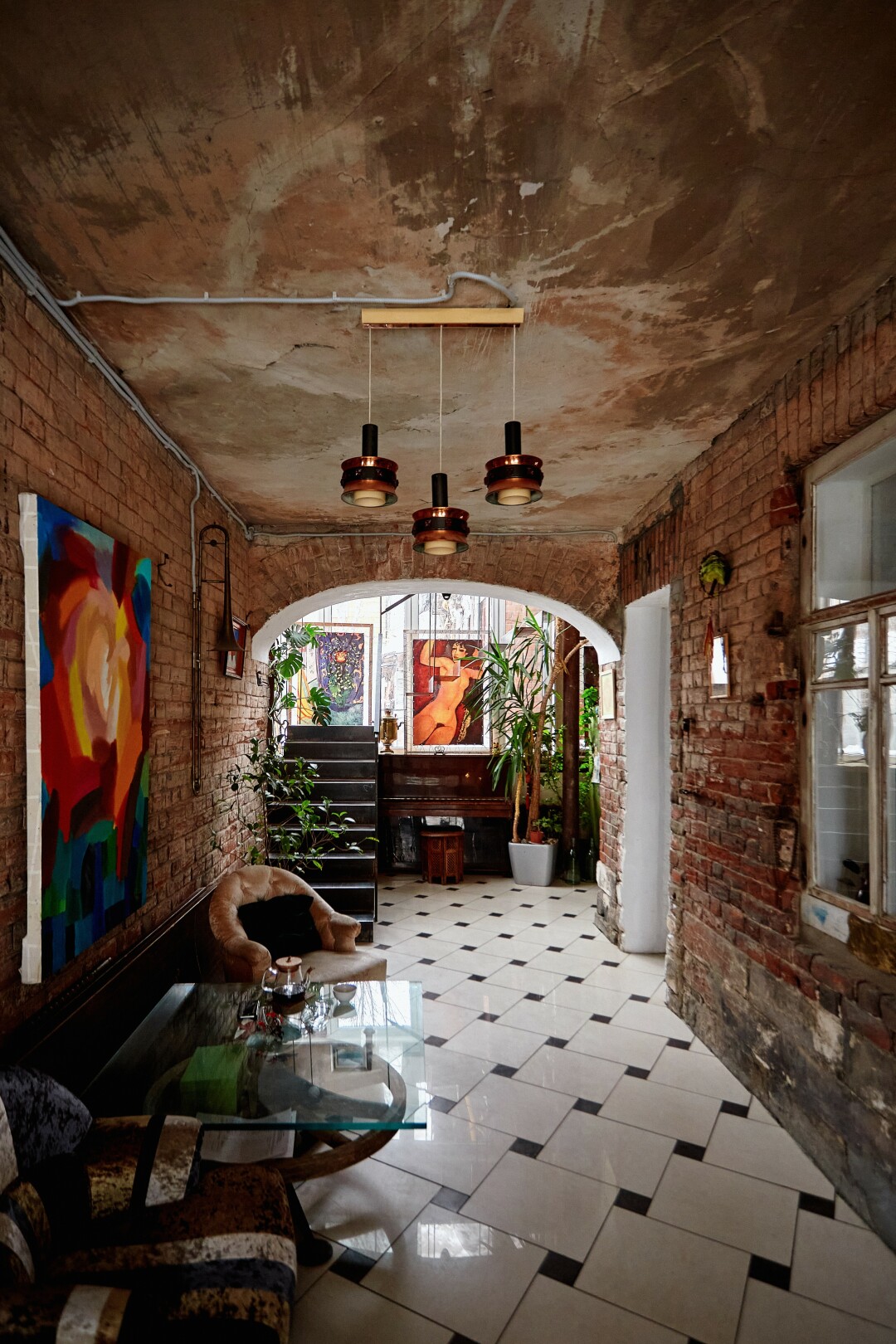 Это атмосфера дома – тот ритм, который мы поймали, когда отсекли все лишнее. А если говорить о каких-то предметах, ну, мы находили здесь какие-то монетки и свидетельства прошлых лет. Например, когда вскрывали на башне полы, нашли пачку старых папирос, на которой четким и каллиграфическим почерком было написано: «Сегодня бросил курить». И было понятно, что тот, кто бросил, бросил навсегда: он на этой пачке последней написал записку и бросил в щель, где она пролежала много лет. Ко мне знакомые, которые любят искать клады, приходили с надеждами найти тут сундуки с золотом. Но золота, конечно, никакого тут не было – это же мещанское поместье. У Поташиных была лавка, но не долго – несколько лет всего. Они, видимо, были крестьянского рода: может, просто нанимались куда-то, может, сдавали комнаты. Но они точно не были богачами – это было понятно по тому, что их поместье началось с деревенской избы, обложенной кирпичом. Они купили участок в 1774 году, к 1886 году у них была одноэтажная каменная лавка, потом в 1890 году они сделали пристрой, а дом во дворе построен в 1882. Когда стал я отковыривать все во дворе, нашел там брусчатку, по которой телеги ездили. А еще у них была конюшня, в которой мы нашли подковы и всякое такое. Интересно: когда ночью выходишь и все затихает, слышится эхо: будто цокают копыта и тени прошлых хозяев здесь еще шелестят.