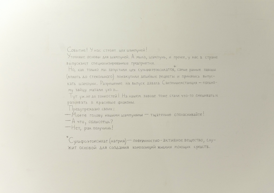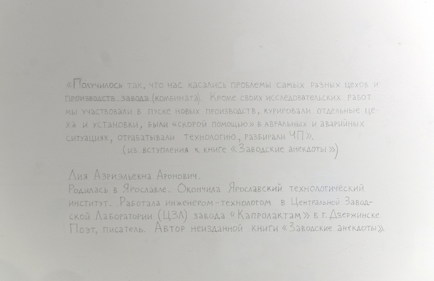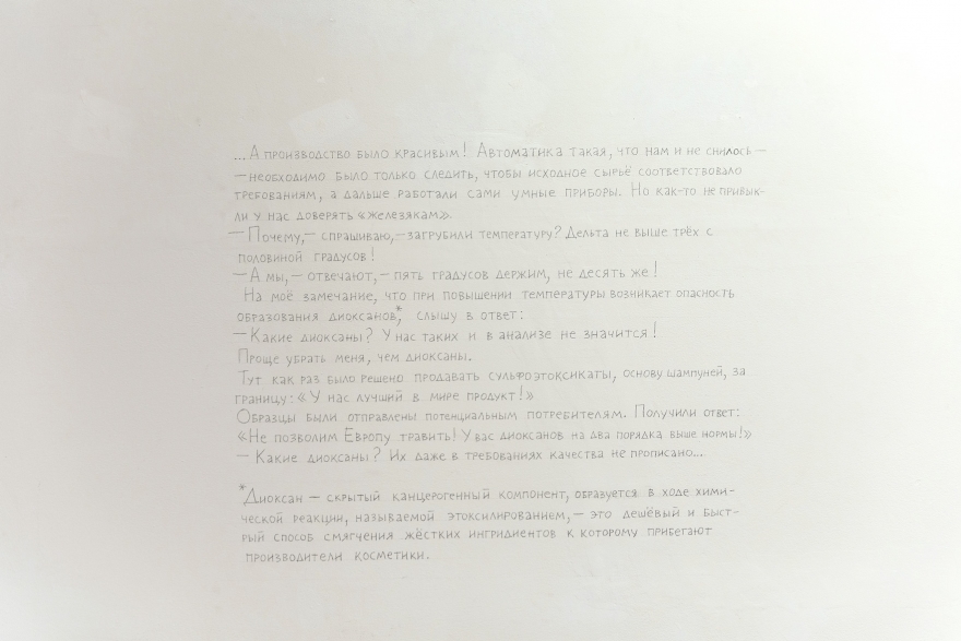 Думаю, что это был бы жанр документальной прозы, нон-фикшн. Мне представляется, что никакая антиутопия или фантастика не сравнится с документальными жанрами по выразительности. Вообще, я считаю, что это самое актуальное направление и в литературе, и в театре, и в изобразительном искусстве. Да и сама выставка «Руины» наполнена цитатами из книги «Заводские анекдоты». Это неизданное произведение поэтессы Лии Аронович, которая много лет работала в центральной заводской лаборатории одного из дзержинских предприятий. Это самый настоящий нон-фикшн, документ эпохи. Там очень своеобразный юмор, много прямой речи и специальной терминологии, связанной с производством. Я специально добавил сноски с пояснениями для таких слов, как, например, «сульфоэтоксилат», или «диоксаны». Короткие тексты как бы обрамляют картины. Голоса героев этой книги на моей выставке – это настоящие голоса призраков, населяющих заводские руины.
