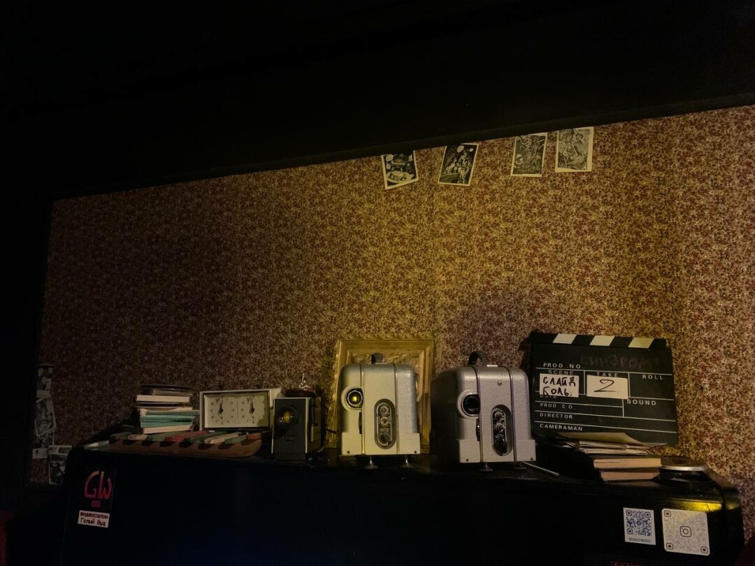 Само помещение небольшое, но уютное. Это две комнаты в черных тонах, в одной из которых расположен недостроенный бар, а в другой — сам кинозал. Внимание сразу приковывают два ключевых объекта обстановки — огромнейший, во всю стену, стеллаж, заставленный видеокассетами, и монструозный пузатый телевизор. Он включен — на экране идет очередная стычка Тома и Джерри.