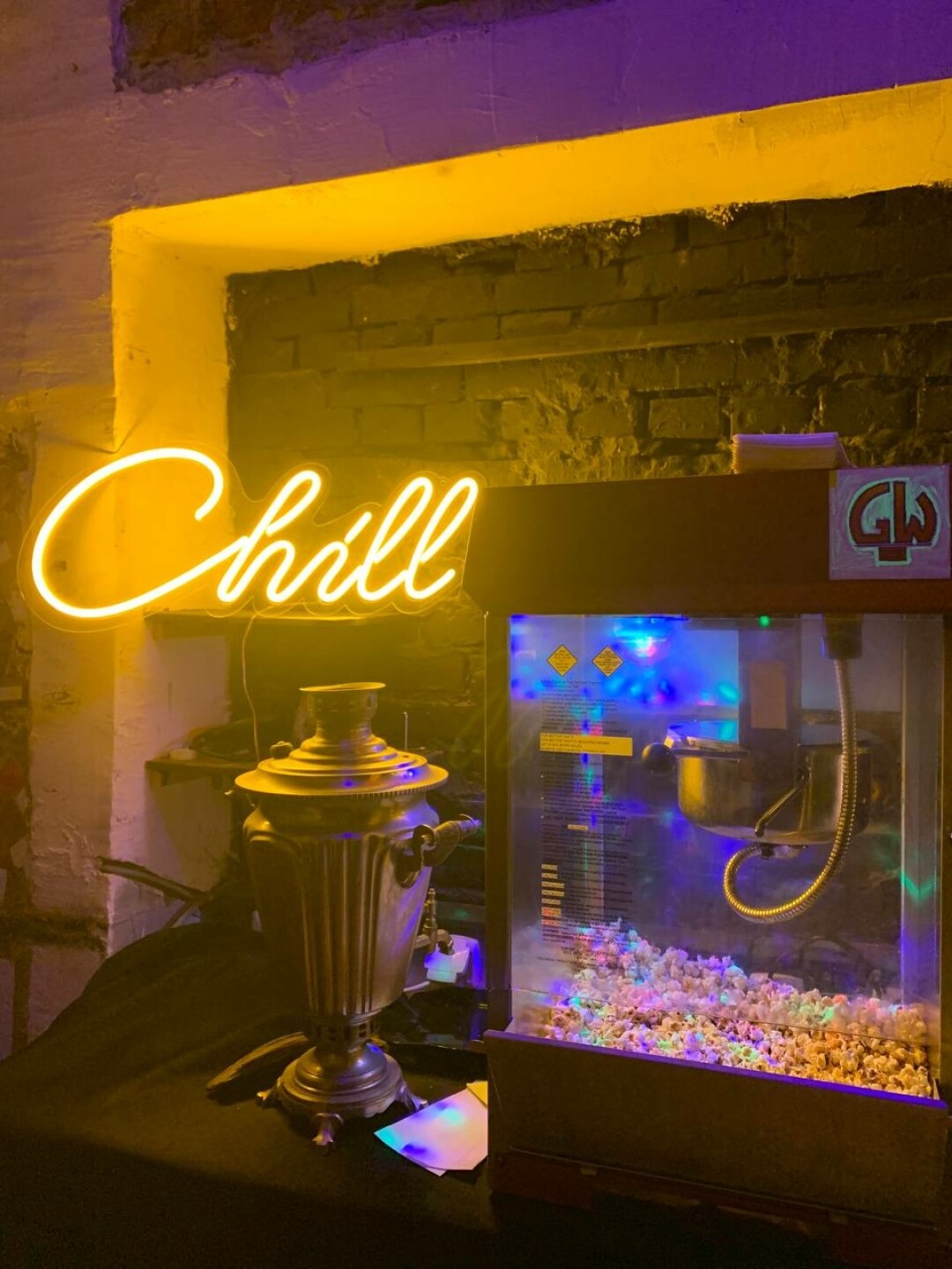 Меня встречают Артем Груздев и Евдокия-Аргентина Корбут — они основатели и хозяева Golyj Wood. Пока Артем занят подготовкой к очередному сеансу в своей операторской, Евдокия-Аргентина предлагает чай и попкорн. Он готовится в точно таком же автомате, как в настоящих, больших кинотеатрах.