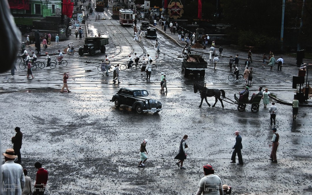 Прогулка Дау и Норы (в левом нижнем углу) по четырехкилометровой улице снималась с участием массовки в 1200 человек