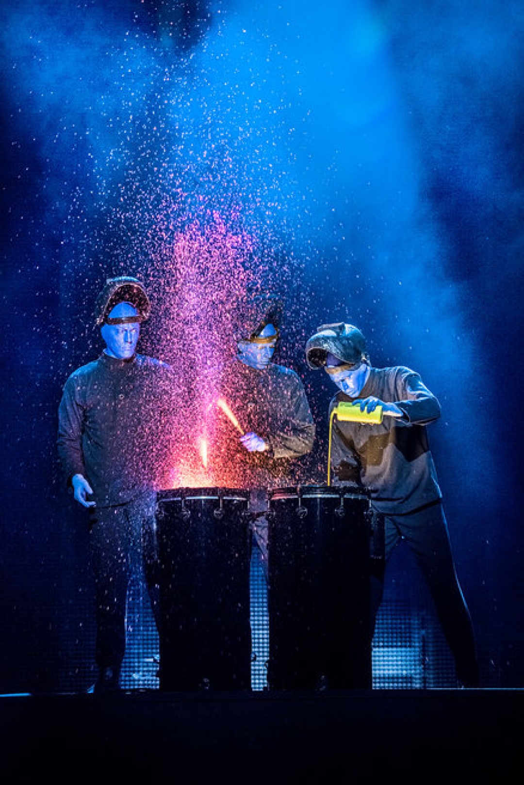 Blue Man Group — международная компания, работающая в сфере живых развлечений. Основали группу Мэтт Голдман, Фил Стантон и Крис Винк в 1987 году. Сейчас они руководят компанией, а для потенциальных «блюменов» организуются кастинги. В центре их шоу – три синих персонажа, говорят с публикой мимикой и языком тела, с помощью музыки, движения и цвета. Не менее колоритны их инструменты – «блюмены» играют даже на ПВХ-трубах. Масштаб перформансов можно понять по цифрам: каждую неделю коллектив использует 60 мембран для барабанов, 190 литров специально смешанной краски трех ярких цветов, 385 зефирок,15 кг фруктового желе, 21 парик, имитирующий лысину.