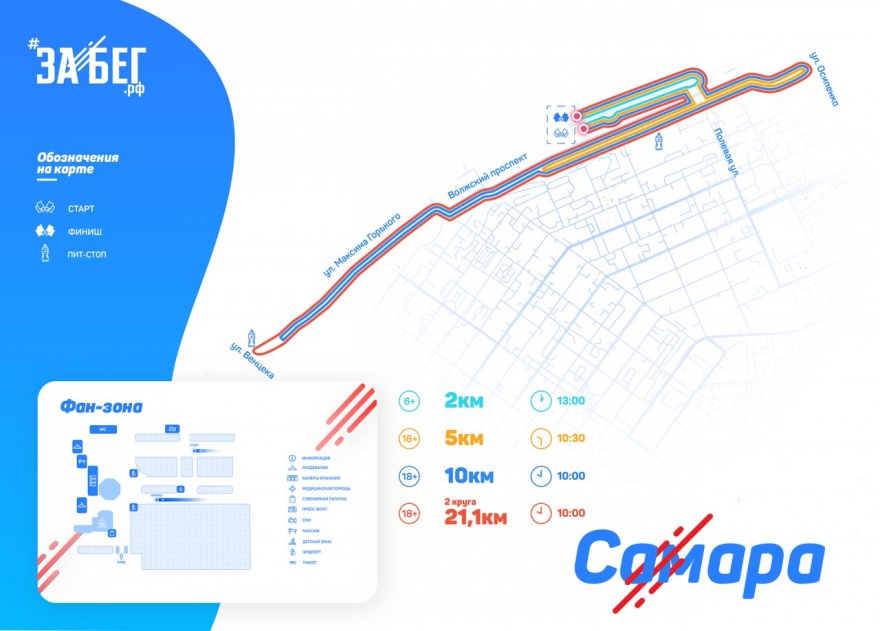 Полумарафон «ЗаБег» пройдет в 15 городах России, в том числе в Самаре, 20 мая. Для бегунов предусмотрены четыре дистанции разной сложности: 21,1 км,10 км, 5 км, 2 км. Также будет действовать фан-зона с развлечениями. С подробностями и правилами участия можно ознакомиться на сайте.
