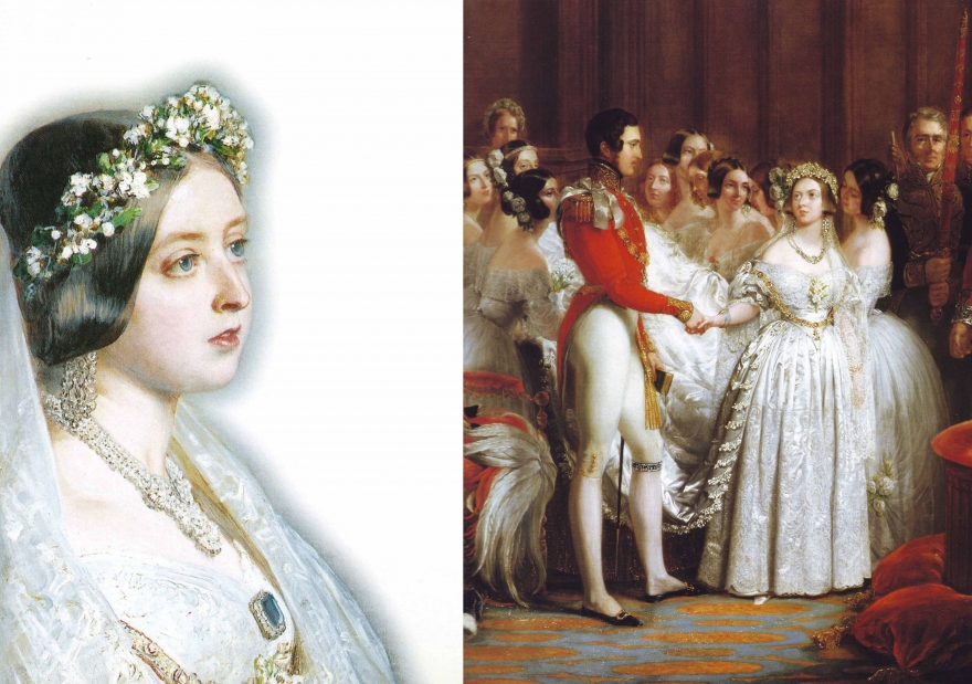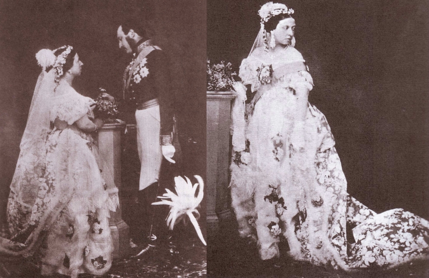 Стоит начать говорить о свадебных традициях, как в первую очередь приходится упомянуть королеву Викторию. И во вторую очередь. И в третью. Белое свадебное платье? 1840 год, подвенечное платье Виктории, из белого атласа и кружев Хонитон, задавшее мировой стандарт на последующие полтора века. Марш Мендельсона? 1858 год, специально написан для бракосочетания дочери Виктории. Свадебные фотографии? Опять Виктория, в 1854 году, спустя 14 лет после свадьбы, повторившая церемонию специально для того, чтобы воспользоваться новомодным изобретением. Фотокарточки Виктории и Альберта в свадебных нарядах разошлись по всей Европе, и уже к 1860-м станет модно публиковать в газетах подробные отчеты об аристократических свадьбах с описанием одежды невесты, жениха и гостей.