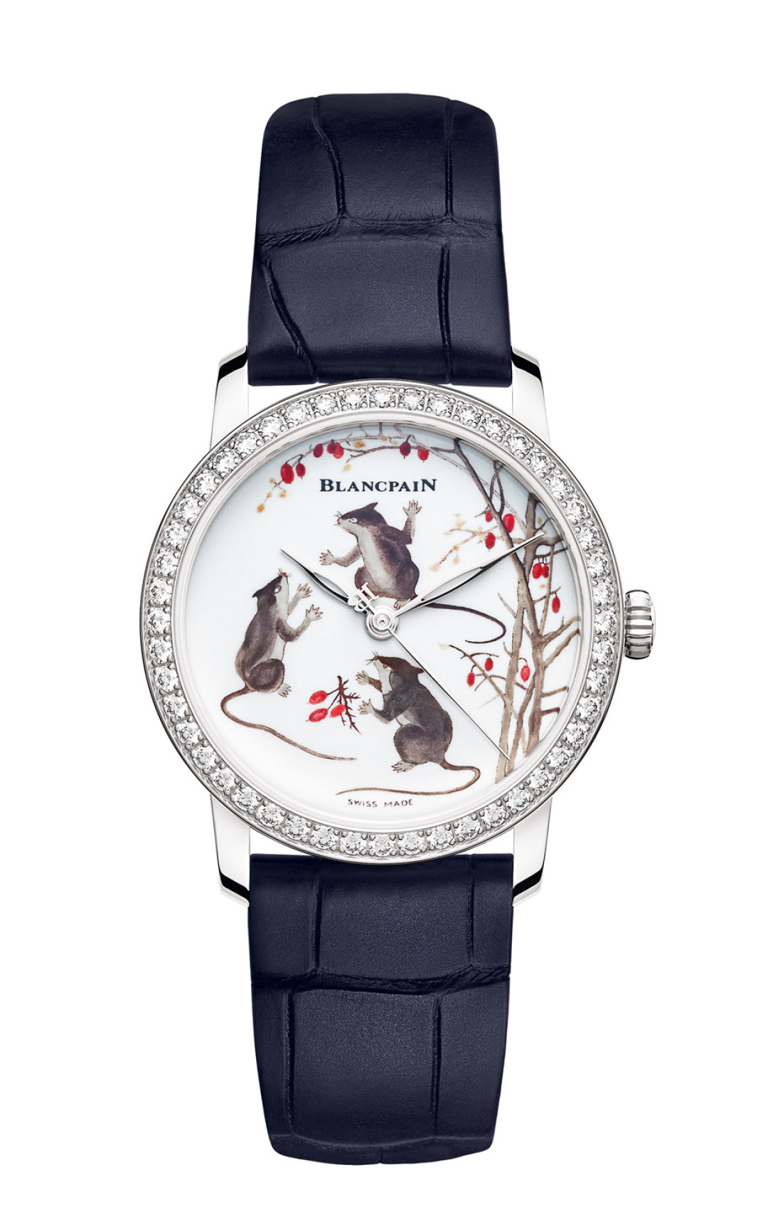 На мануфактуре в Ле-Брассю целый год бились над тем, чтобы выдать идеальные, как блюдечки из сервиза, фарфоровые циферблаты с ручной росписью. Каждый из восьми прошел несколько фаз сушки и обжига при температуре до 1300 °С, а затем был обрамлен корпусом из белого золота и безелем с 48 бриллиантами.