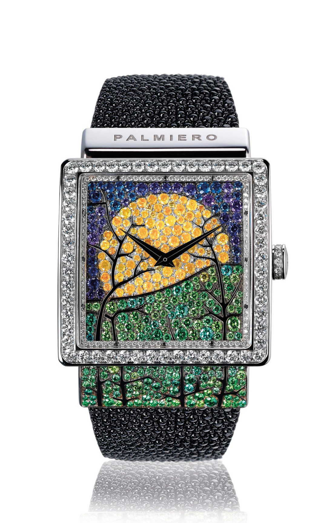 Ювелир Карло Пальмиеро предлагает носить панно из драгоценных камней прямо на запястье — как эти часы из «сказочной» коллекции, вымощенные разноцветными сапфирами с прожилками черненого золота.