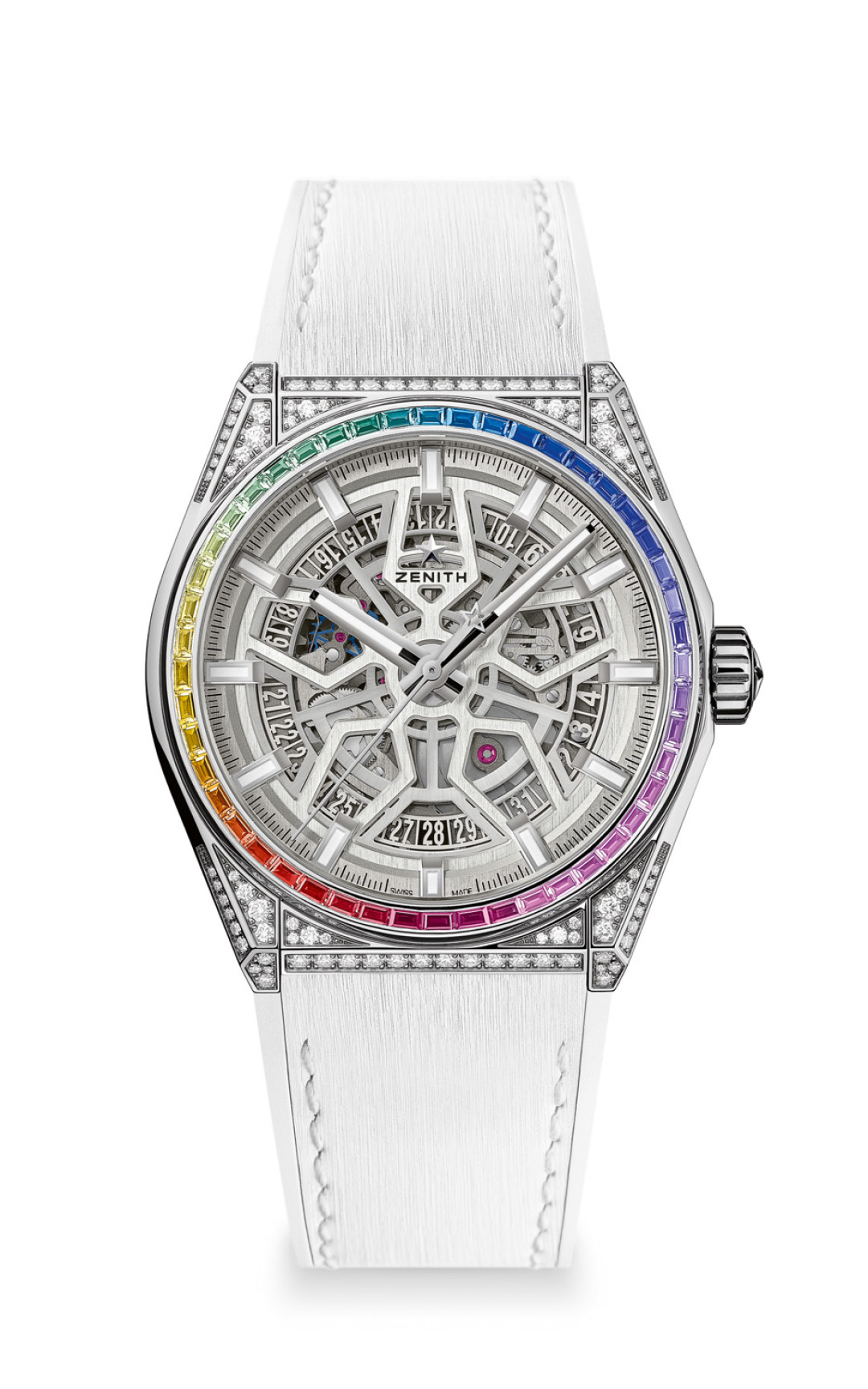 Инкрустируя 41-миллиметровый титановый корпус и безель роскошных часов Zenith Defy Classic High Jewellery Rainbow, ювелиры проделали (уместная тавтология!) титаническую работу. Мы о безупречной подборке драгоценных камней. 48 сапфиров багетной огранки полной радугой расставлены по оттенкам спектра. А слияние всех видимых цветов — белый — демонстрируют 288 бриллиантов.