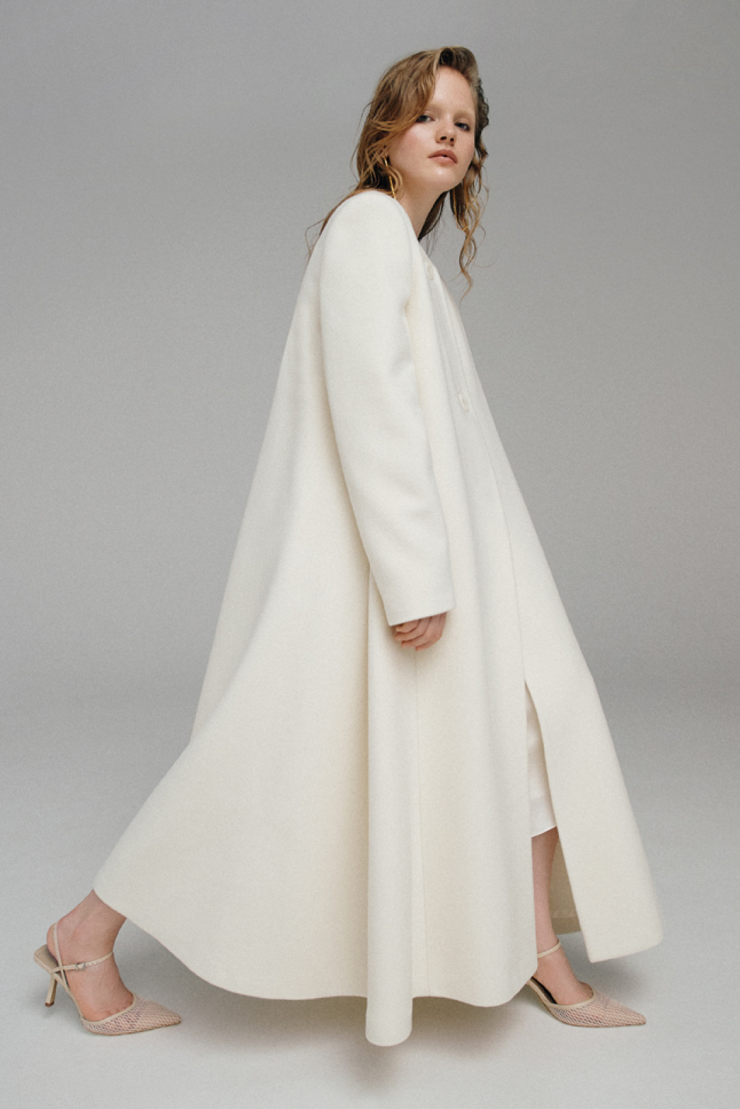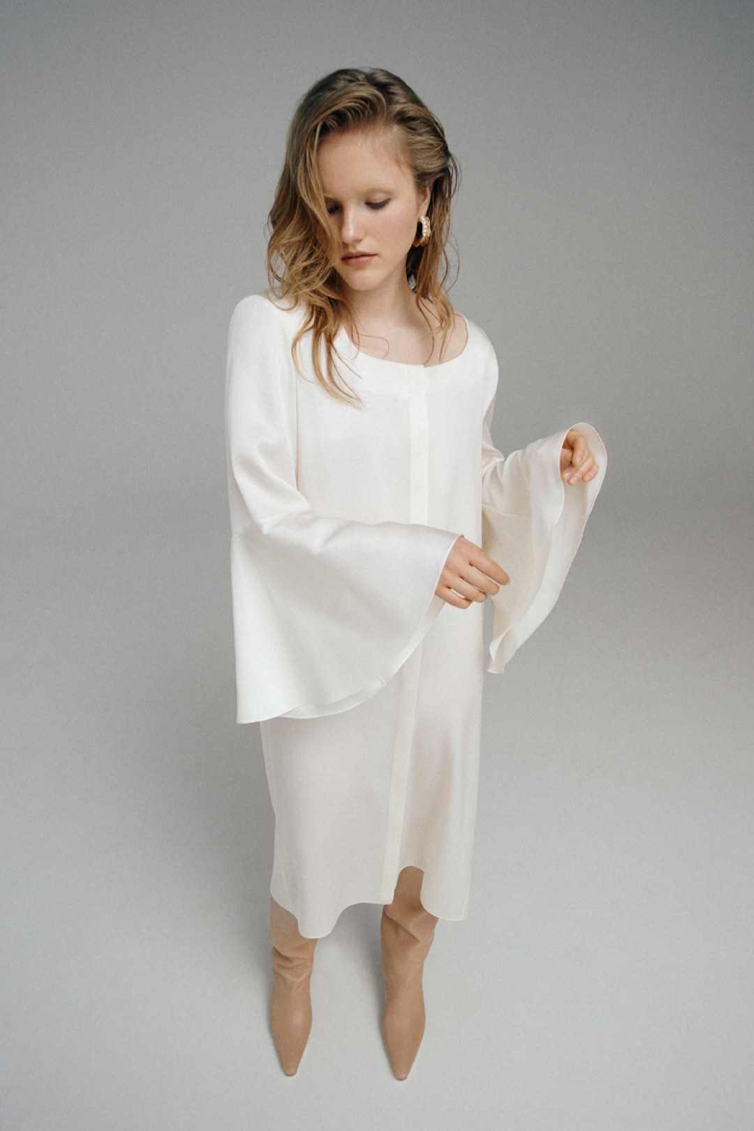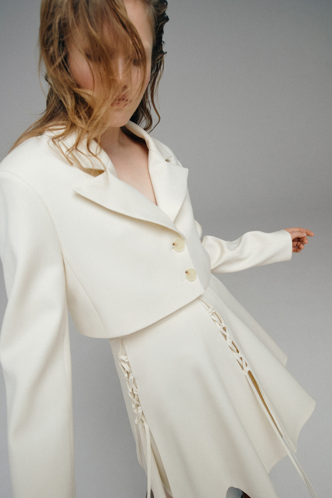 Костюмы цвета парного молока декорировали шелковыми шнурками, а белое платье-комбинацию дополнили открытой спиной. Эклектичные детали вещей раскрываются в движении, делая коллекцию динамичной и добавляя гардеробу настроение lyric touch.