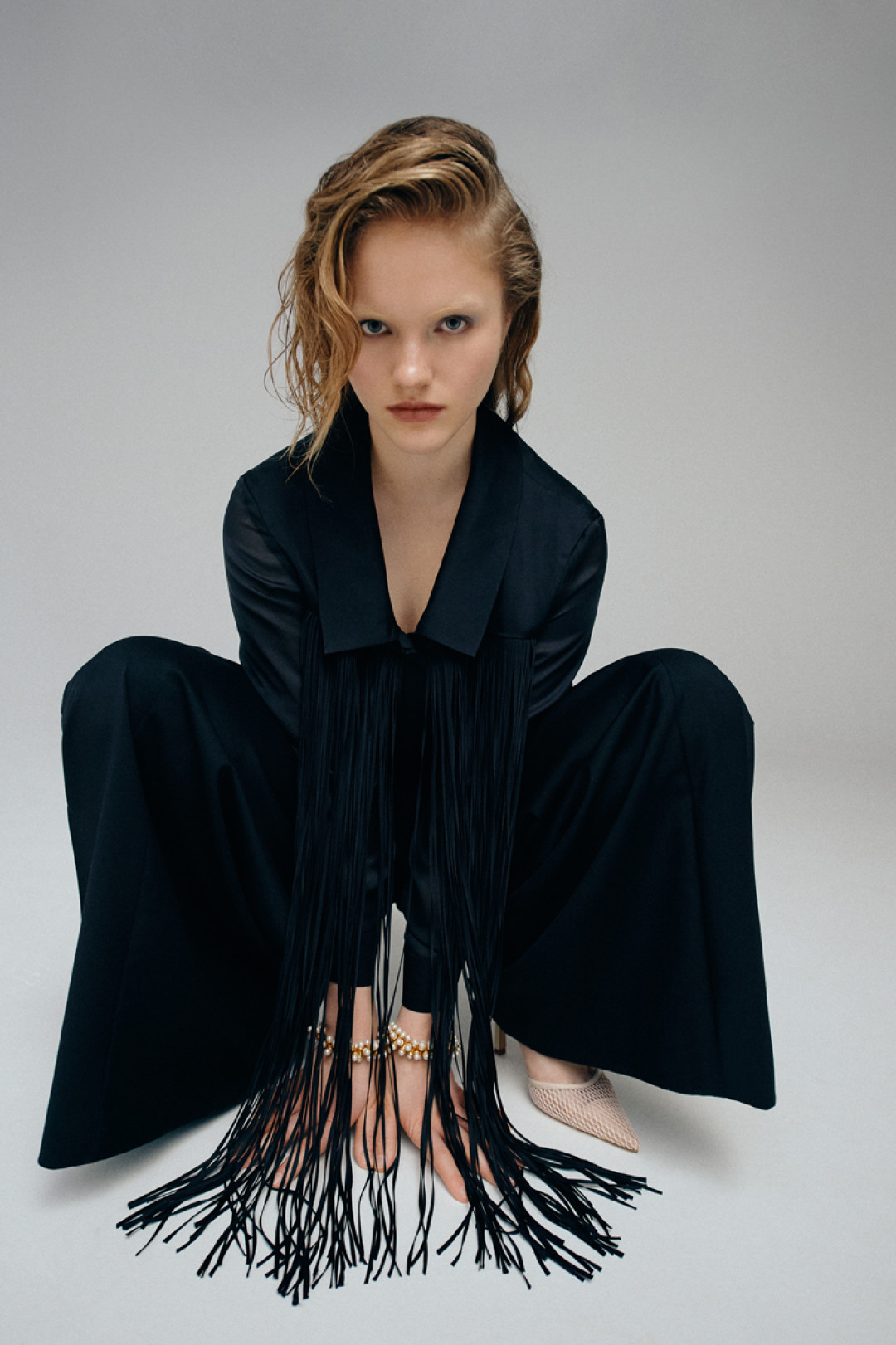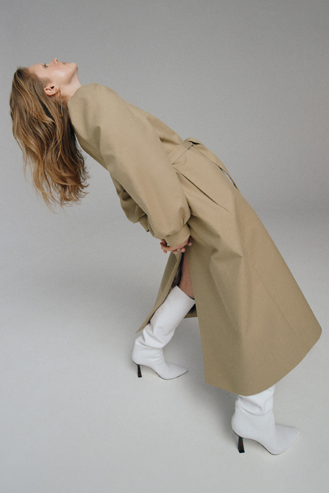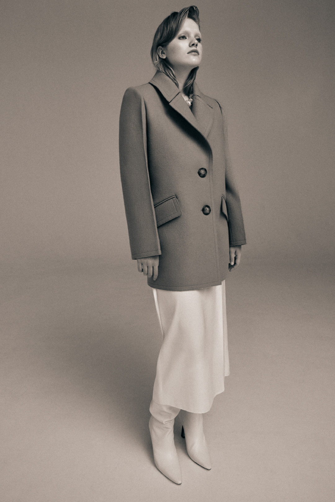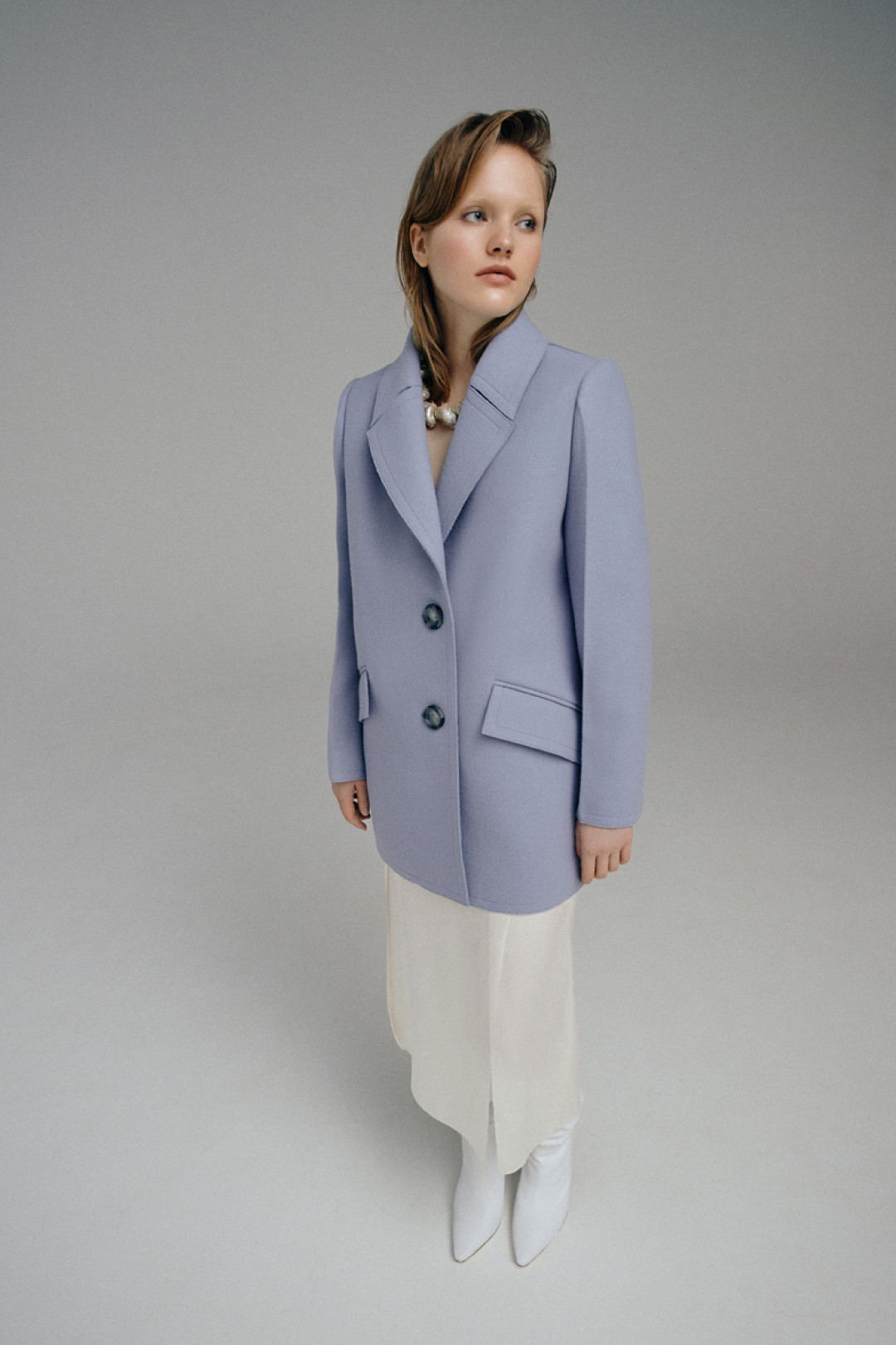 Костюмы цвета парного молока декорировали шелковыми шнурками, а белое платье-комбинацию дополнили открытой спиной. Эклектичные детали вещей раскрываются в движении, делая коллекцию динамичной и добавляя гардеробу настроение lyric touch.