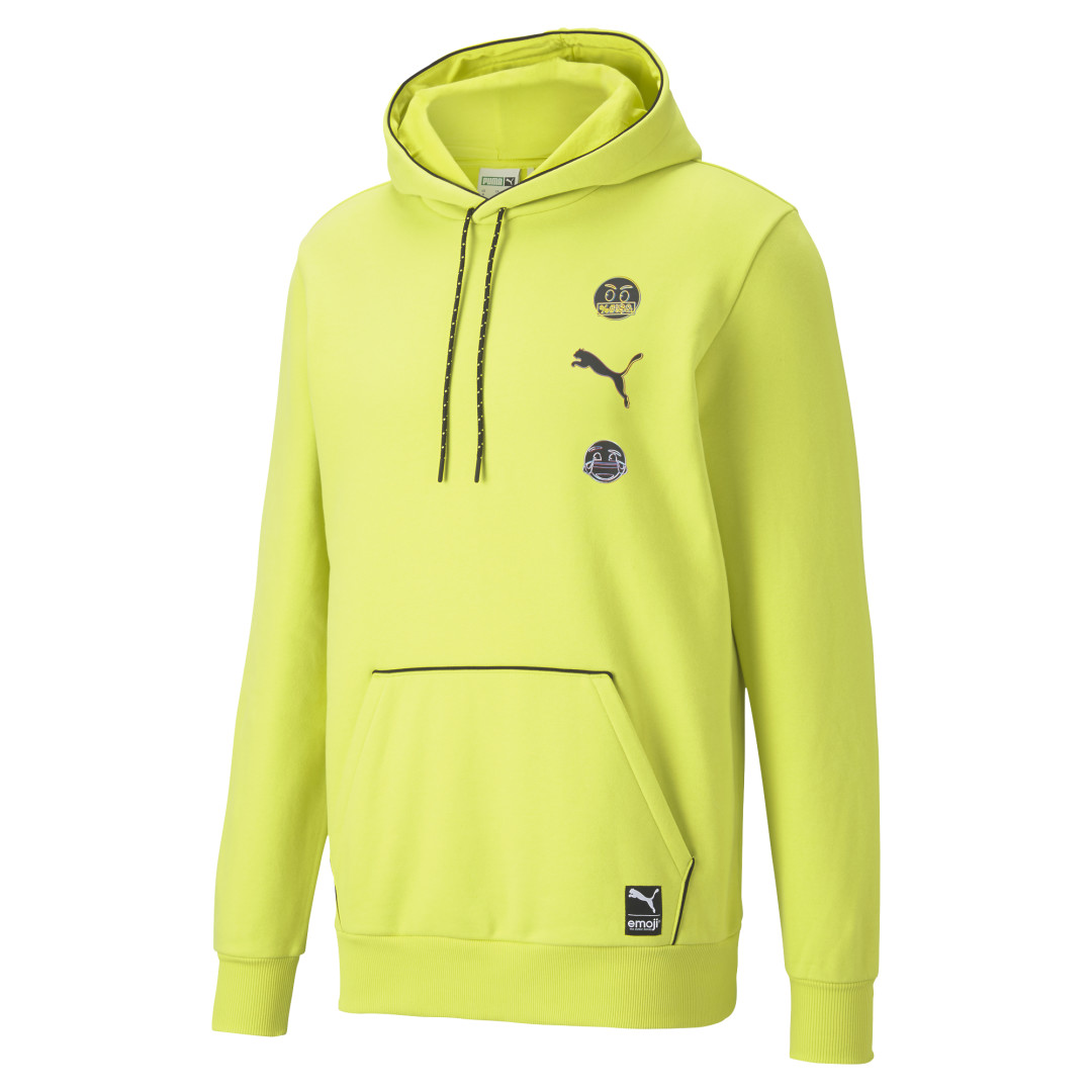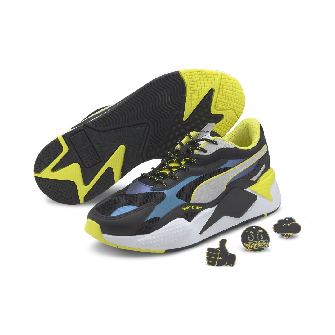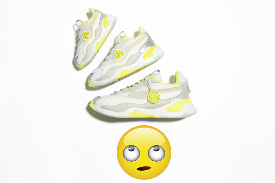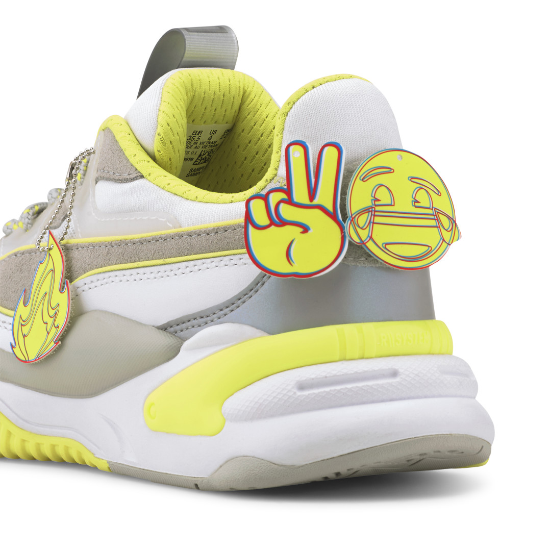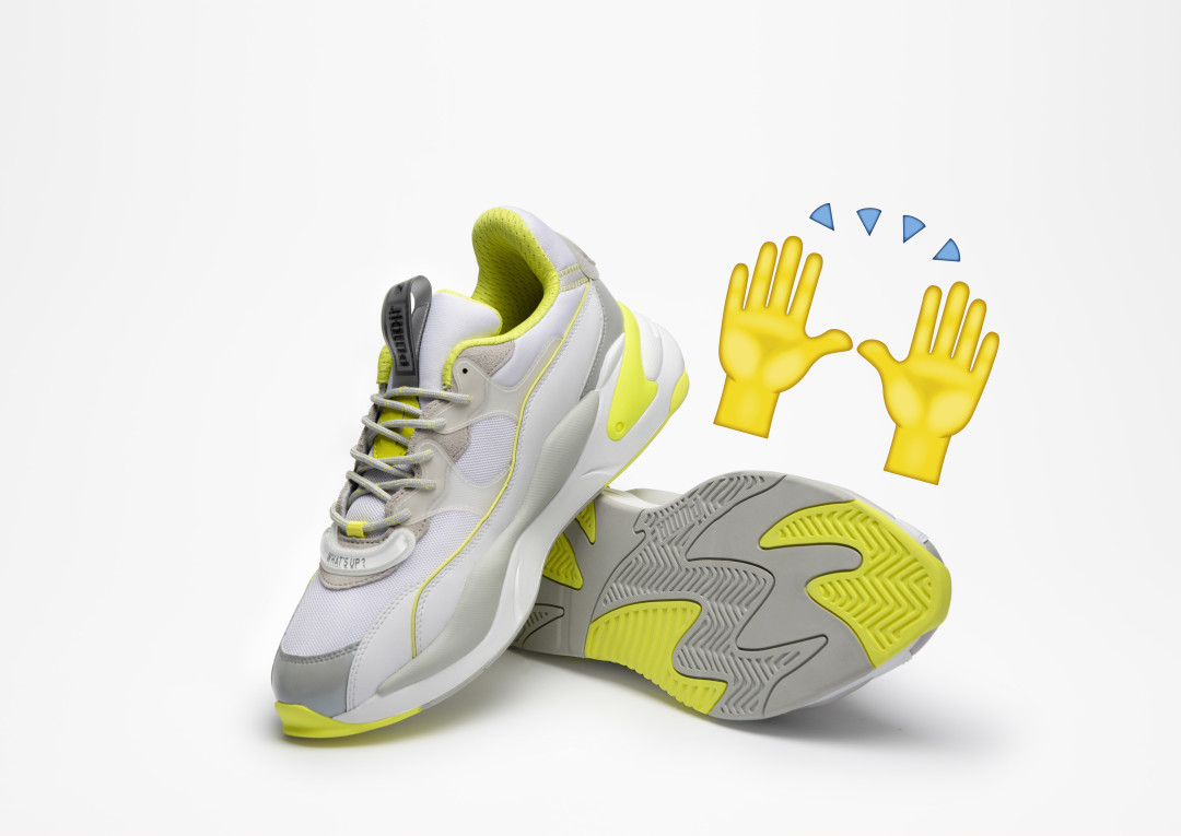 В комплекте с кроссовками RS-2 и RS-3 — съемные патчи в виде эмоджи, которые крепятся на заднюю часть обуви. Также эти две модели украшает надпись «What’s Up?»: у RS-2 она расположена на носке, у RS-3 — сбоку. Футболка и худи PUMA X emoji представлены в черном, сером и желтом цветах, каждый айтем дополнен множеством значков эмоджи. Еще в коллаборации есть спортивные брюки серого и черного оттенков также с изображениями эмоджи.