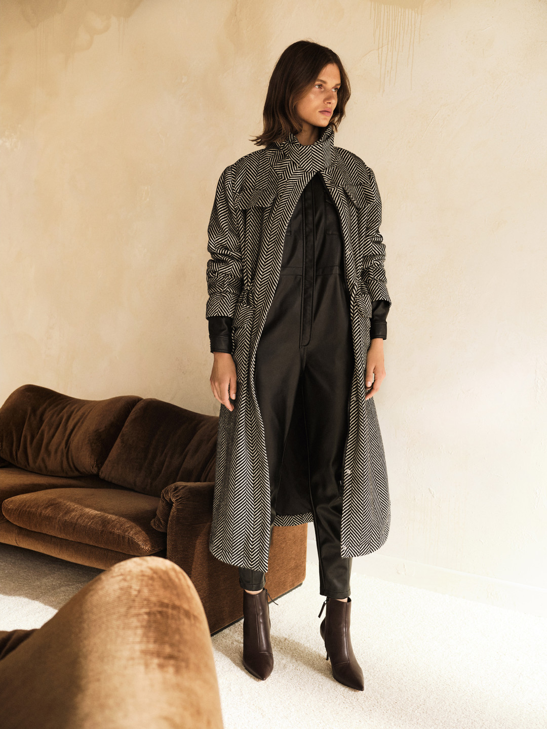 Модели демонстрируют трикотажные платья, комбинезон и рубашку из экокожи, монохромные и твидовый костюмы, жакеты и пальто герметичного кроя. Сдержанность коллекции разбавлена искусственным мехом, пышными рукавами на платье, розовым плащом, прозрачным топом, пуховиком белого цвета и серебристым свитером. Все это в сочетании с сапогами на массивной подошве или тонком каблуке, классическими мокасинами и кроссовками. Среди аксессуаров сумка hobo с плетеной текстурой и кожаный берет.