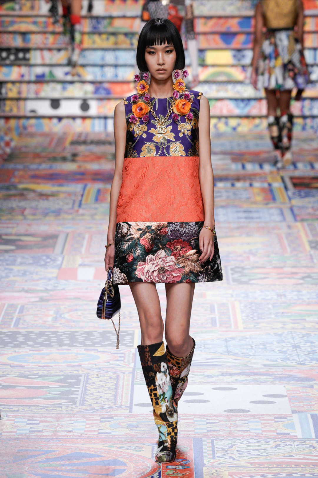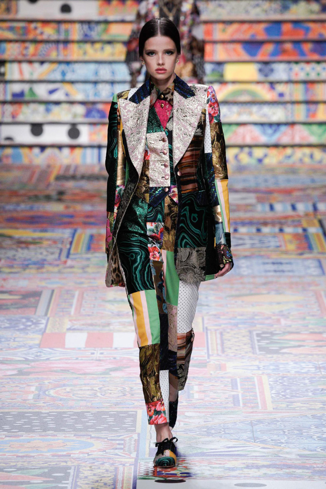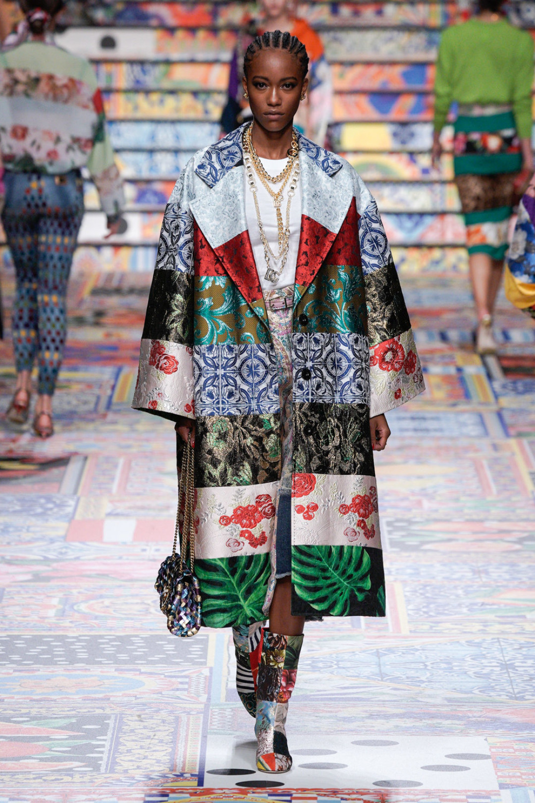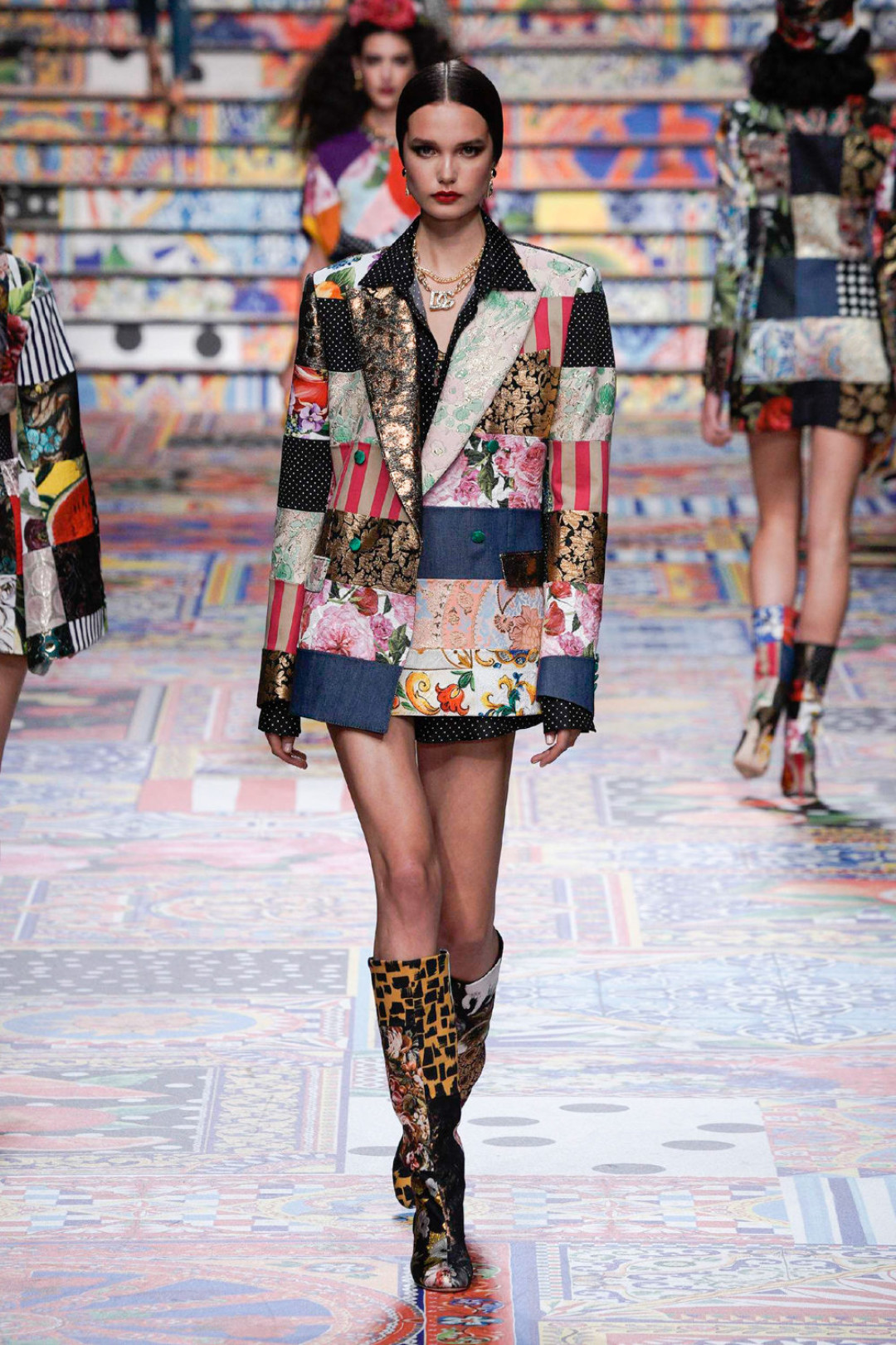 Техника лоскутного шитья стала основой не только для новой коллекции модного дома, но и для оформления локации, в которой прошел показ. Специальное пространство бренда было оформлено с учетом ее принципов — подиум, стены и ступени, по которым спускались модели, украсил сицилийский пэчворк. Этот же орнамент стал главным принтом коллекции весна-лето 2021.