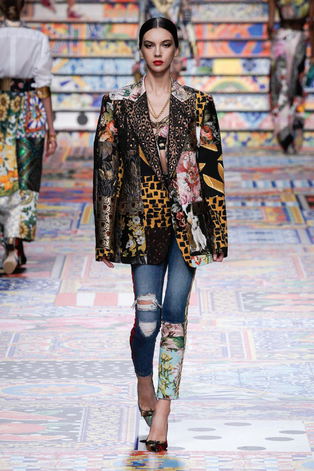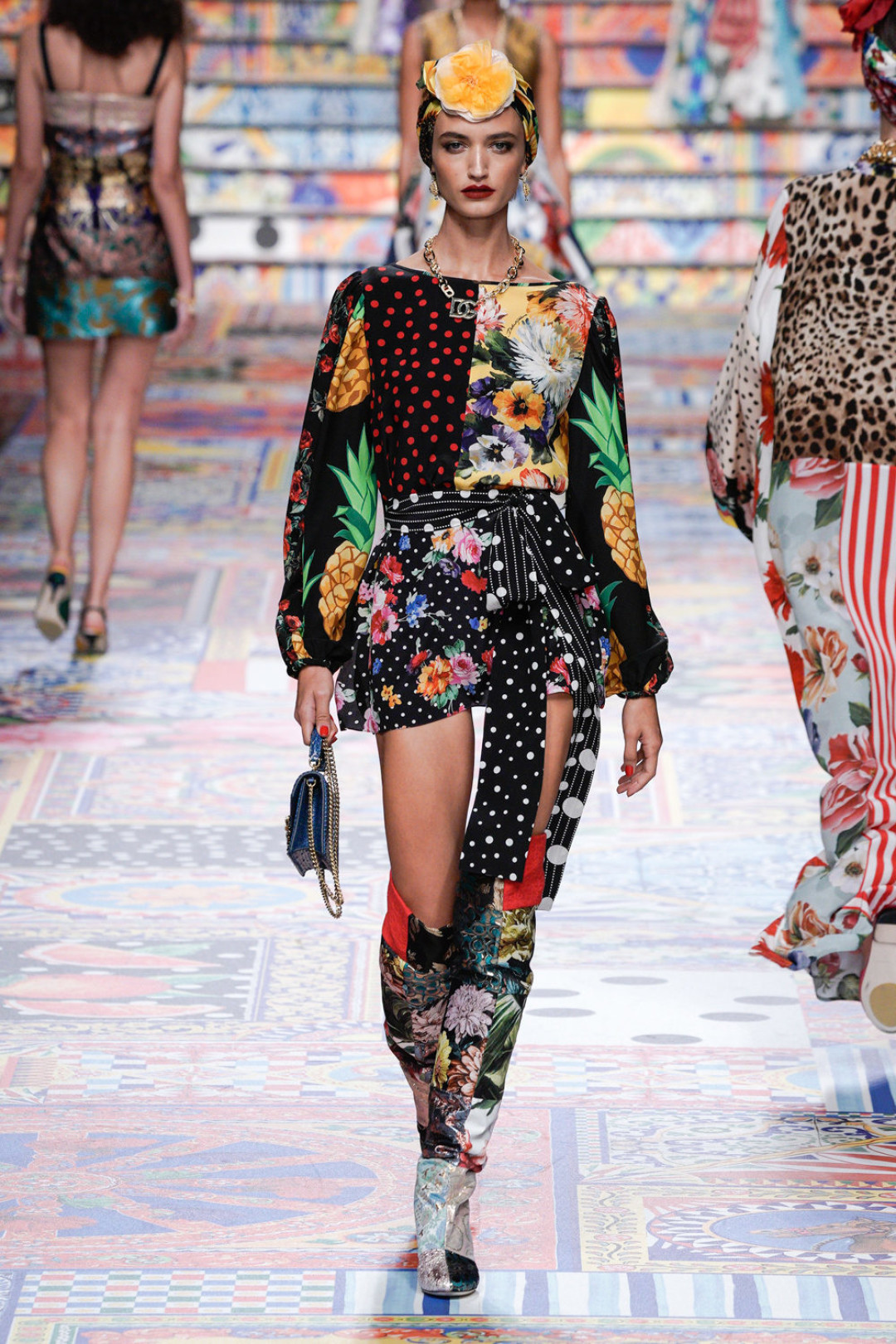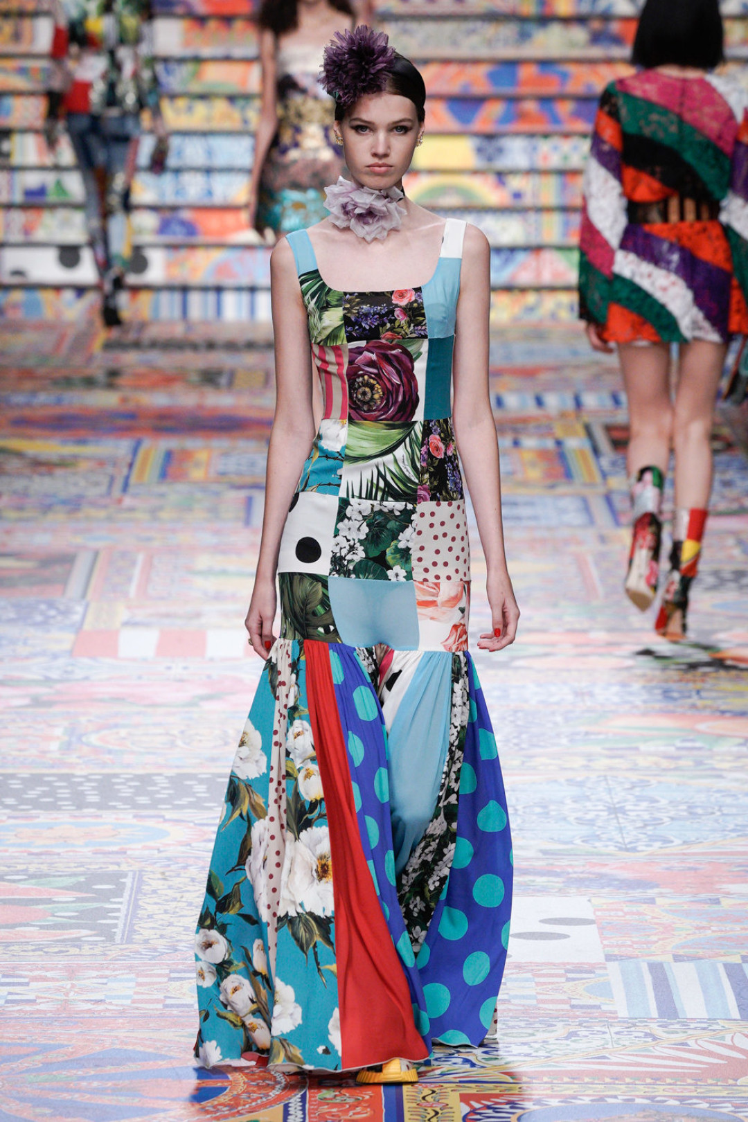 Dolce & Gabbana доказали, что технику пэчворк можно применить к созданию любых вещей: пиджаков, платьев, блуз, джинсов, шорт, велосипедок, топов-бра, пальто и даже обуви. Образы бренда соединили в себе как разные лоскуты ткани, так и разные принты: от гороха до цветочного. Дополнили их тюрбаны и цепи разного диаметра.
