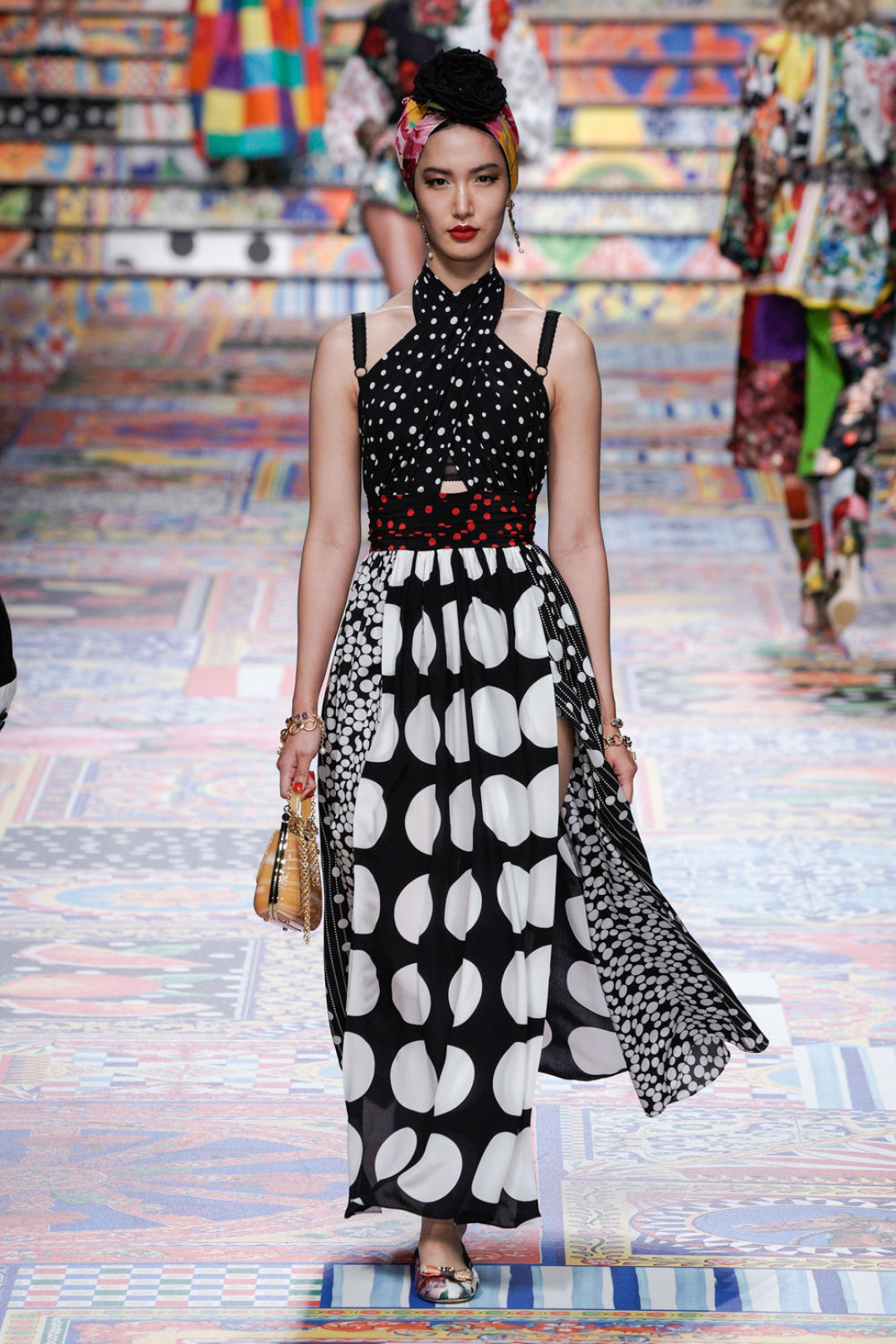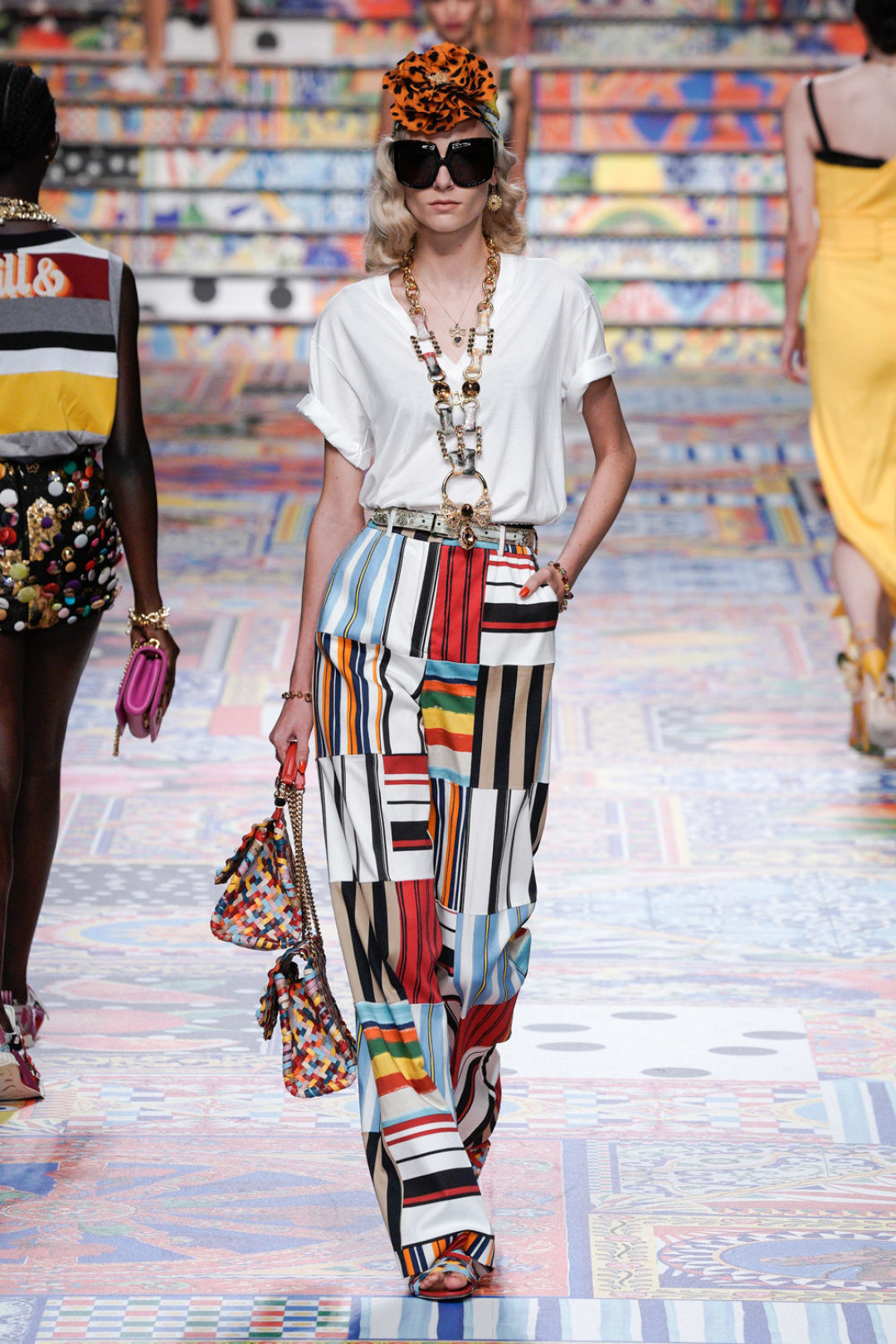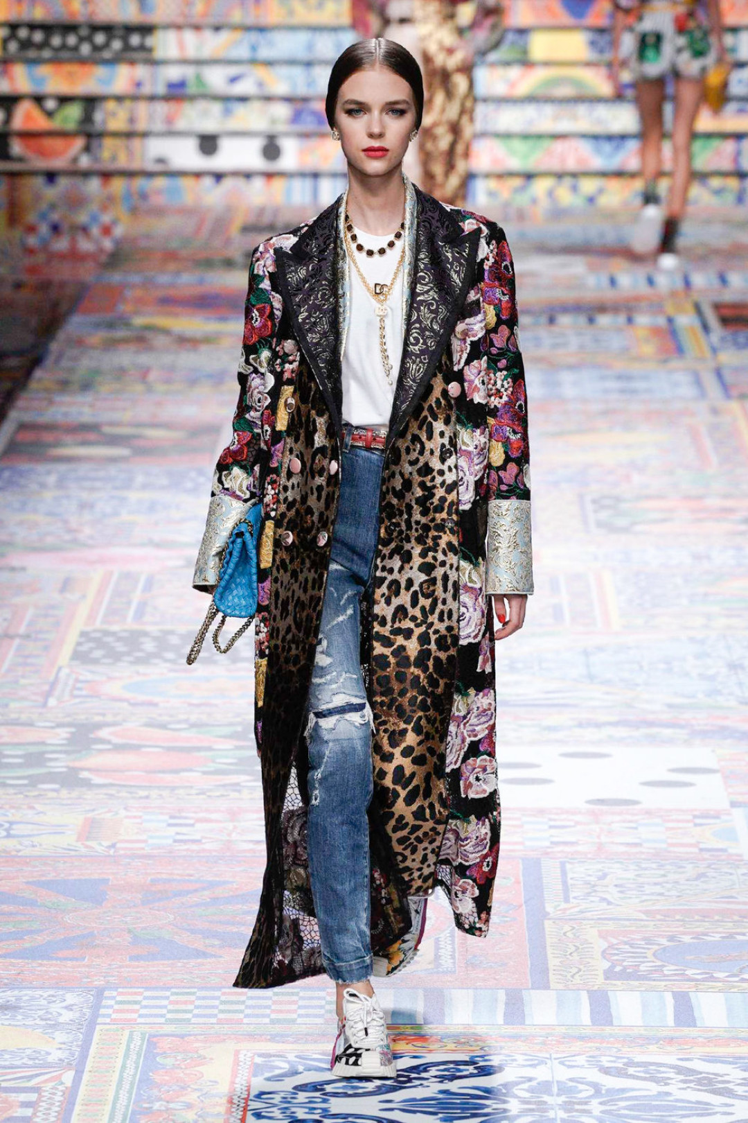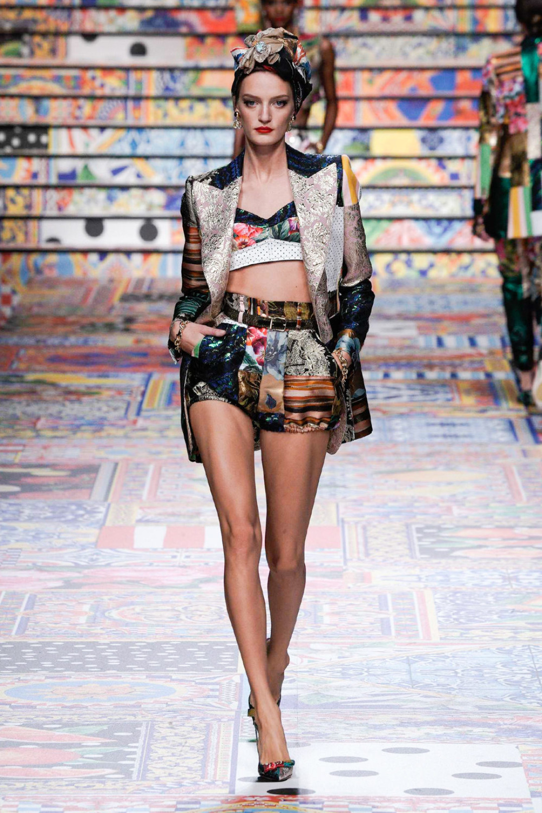 Dolce & Gabbana доказали, что технику пэчворк можно применить к созданию любых вещей: пиджаков, платьев, блуз, джинсов, шорт, велосипедок, топов-бра, пальто и даже обуви. Образы бренда соединили в себе как разные лоскуты ткани, так и разные принты: от гороха до цветочного. Дополнили их тюрбаны и цепи разного диаметра.