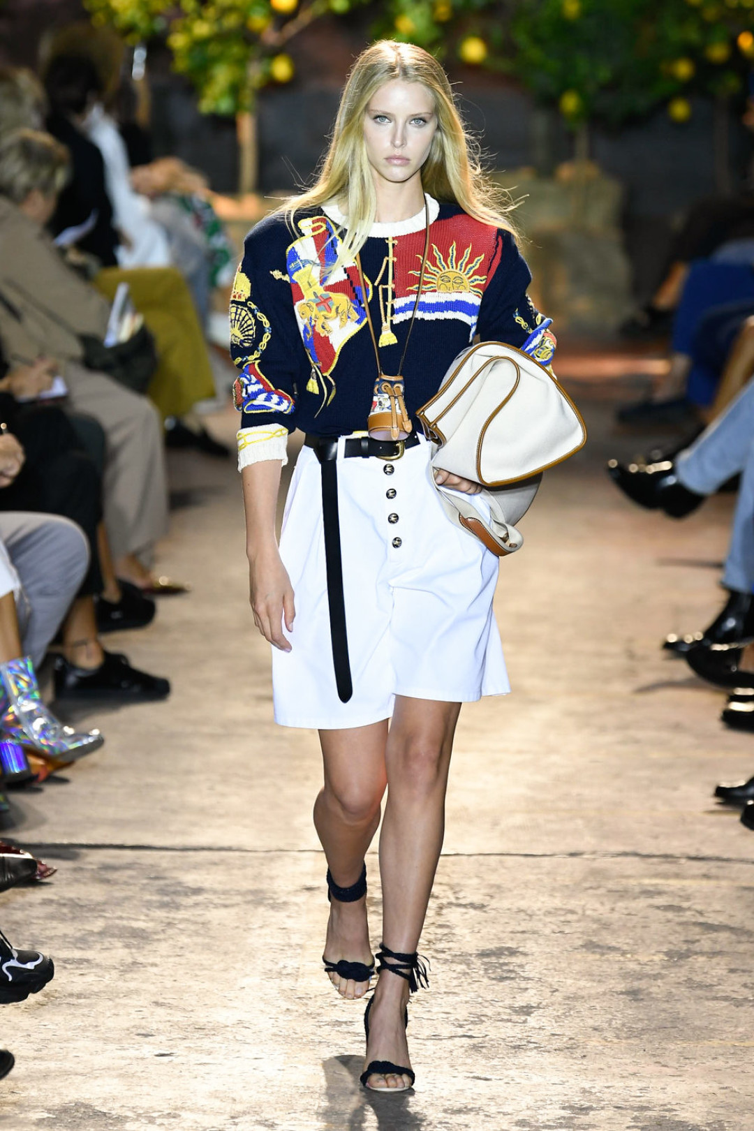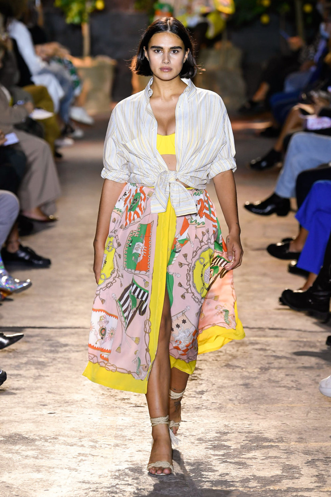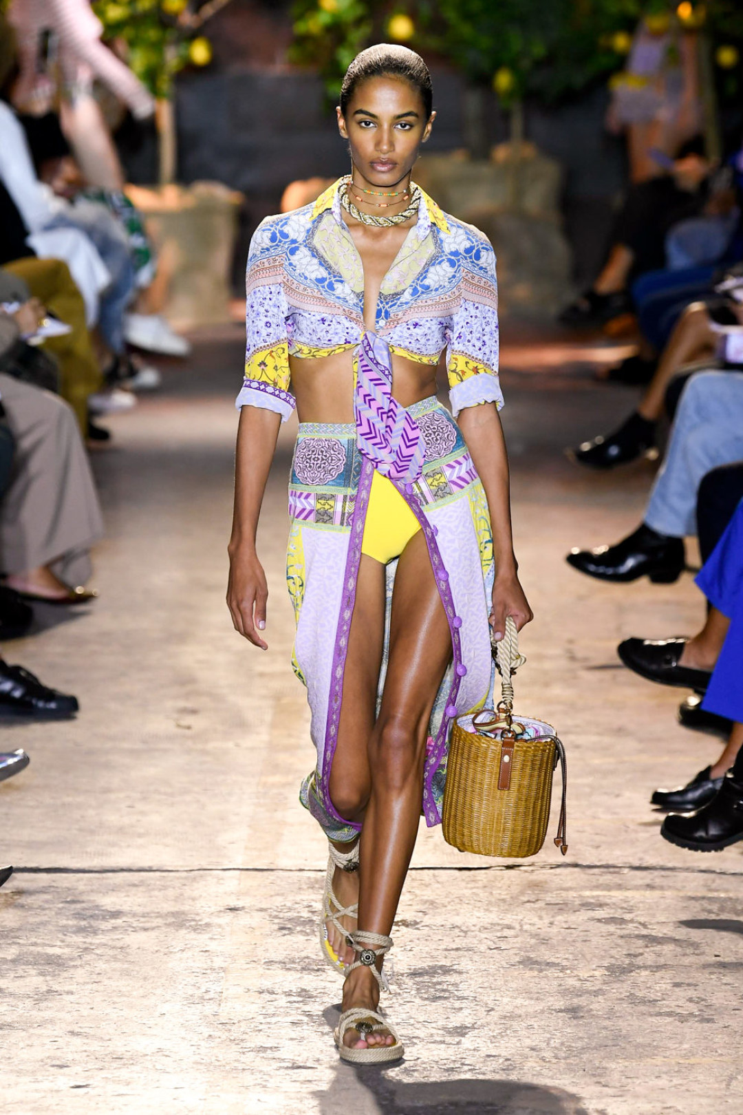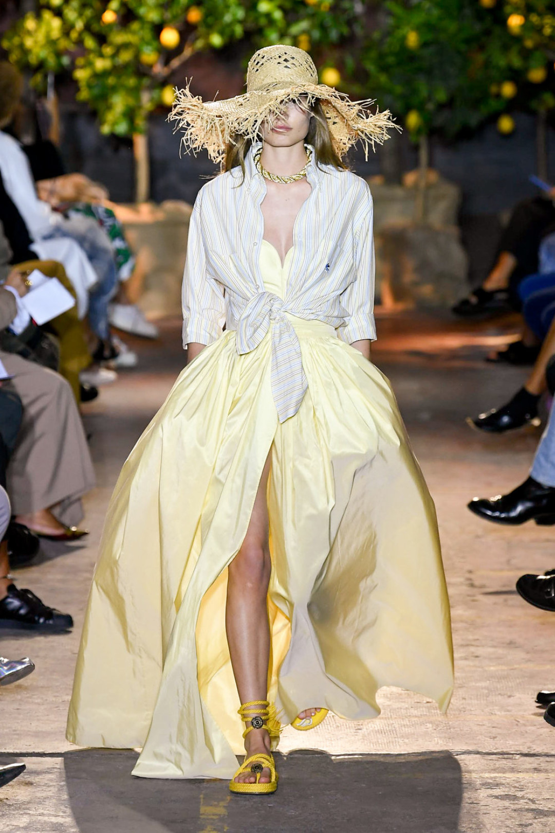 Бренд показал по-настоящему летнюю, даже отпускную коллекцию с мини-шортами и шортами-бермудами, платьями и юбками-парео, топами бра, туниками, рубашками, завязанными на животе, соломенными шляпами, косынками и сандалиями на плоской подошве. Бонусом — вместительные пляжные сумки. Большинство вещей созданы из легких, струящихся материалов.