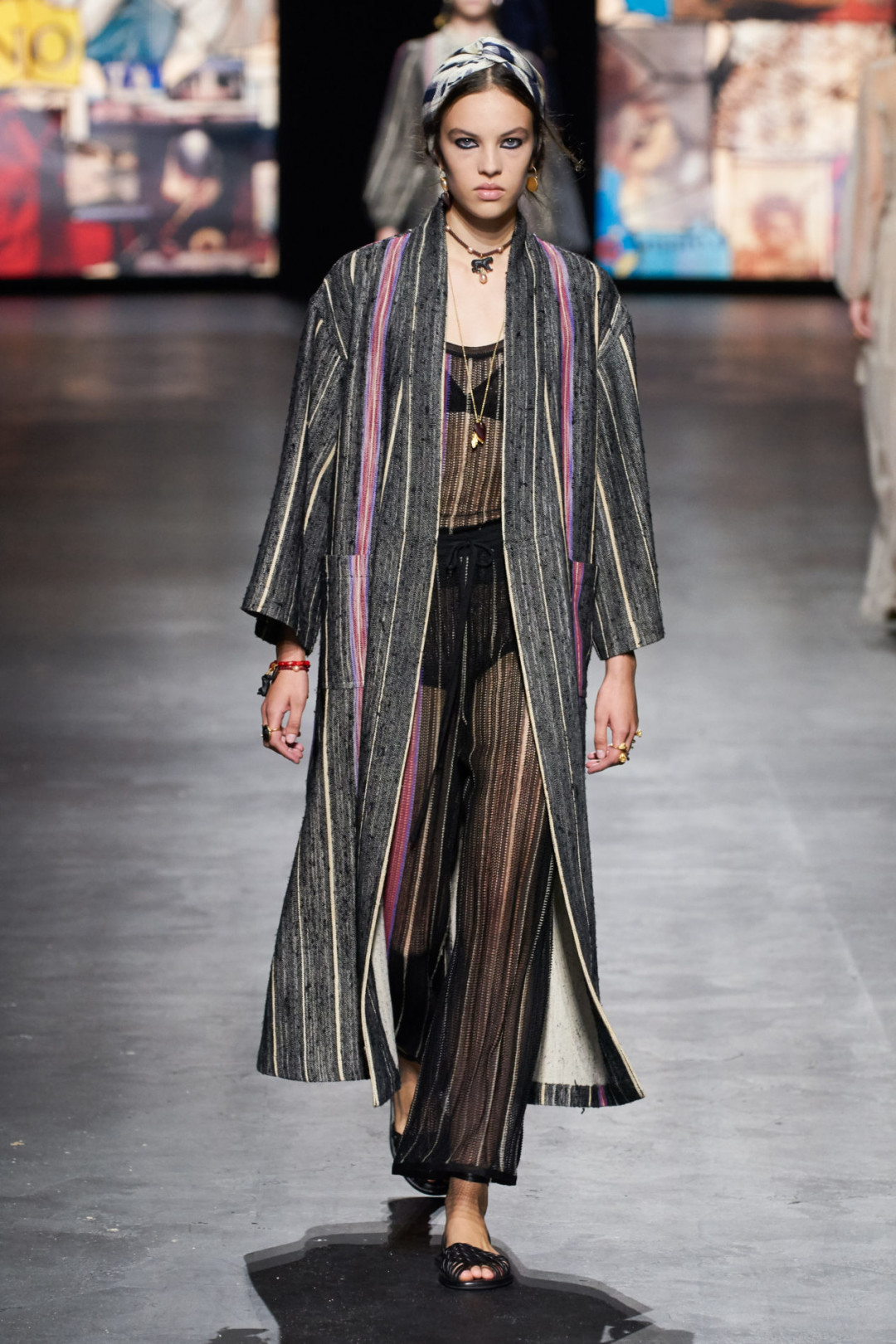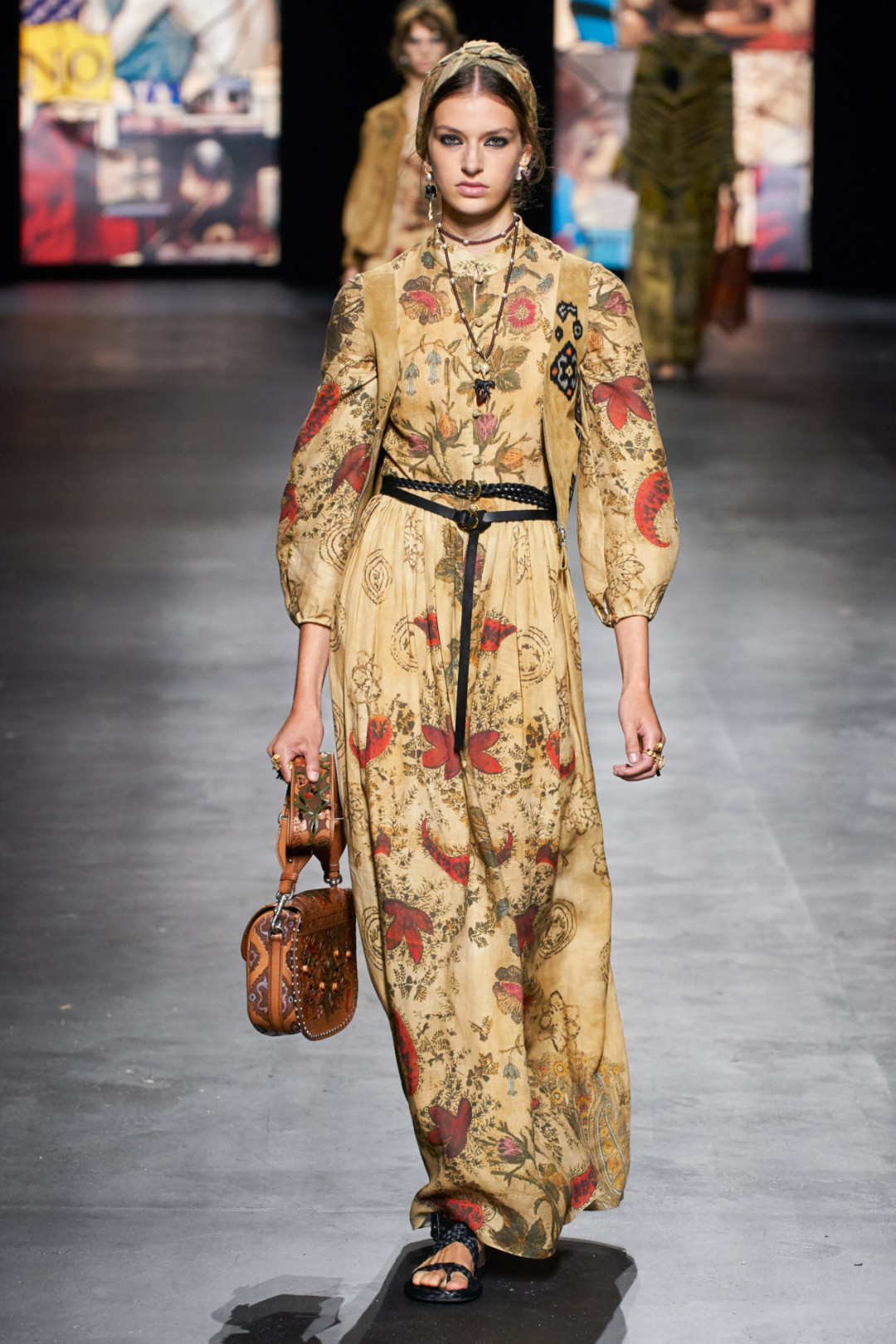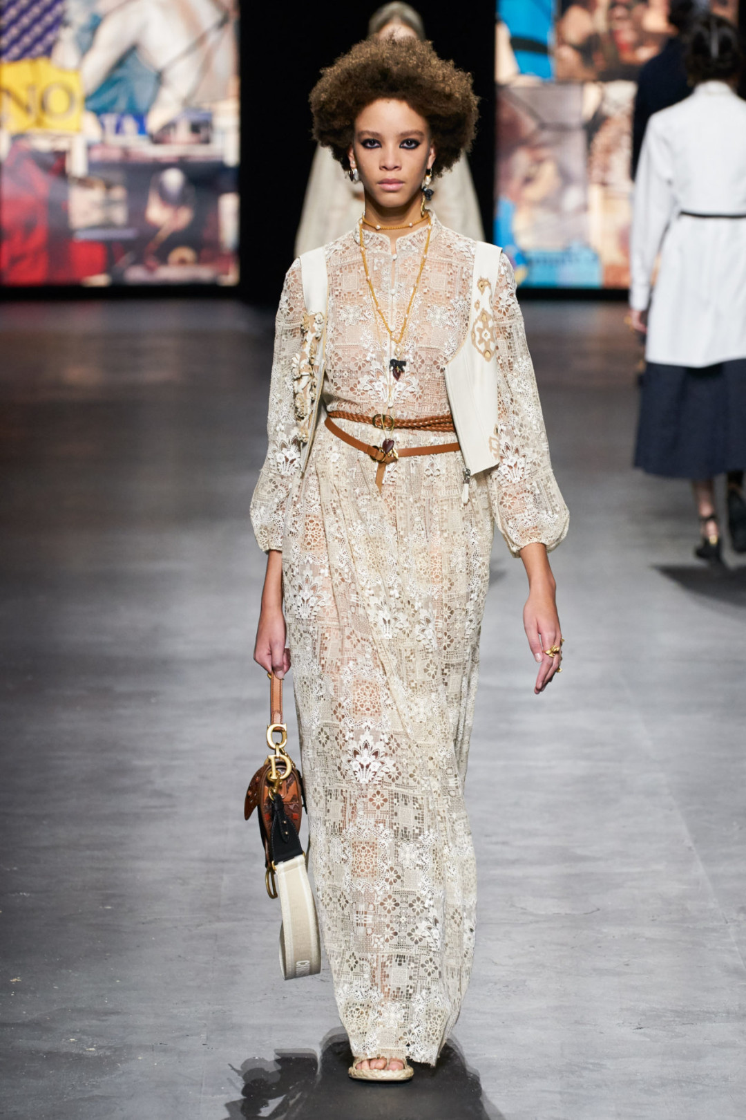 В коллекцию Dior весна-лето 2021 вошли кимоно, кожаные укороченные жилеты, полупрозрачные платья миди и макси, юбки, шорты и бузы с вышивкой в виде цветов, рубашки и свободные брюки. В качестве аксессуаров — тюрбаны, длинные подвески и ремни. На показе отметилась участница протестного движения Extinction Rebellion с плакатом «Мы все жертвы моды» в руках. Она якобы выбежала на подиум.