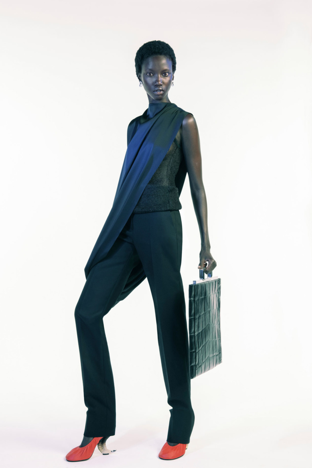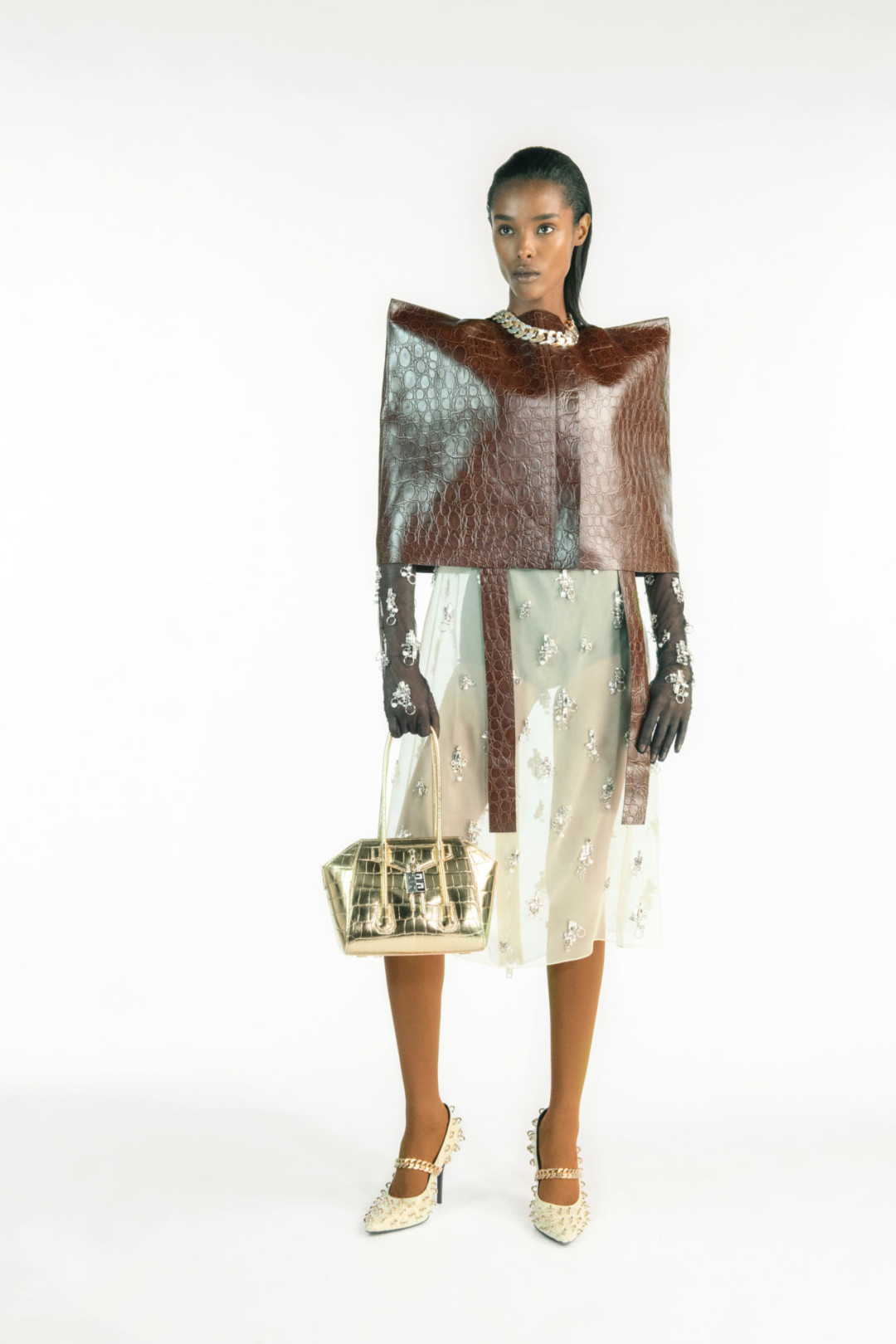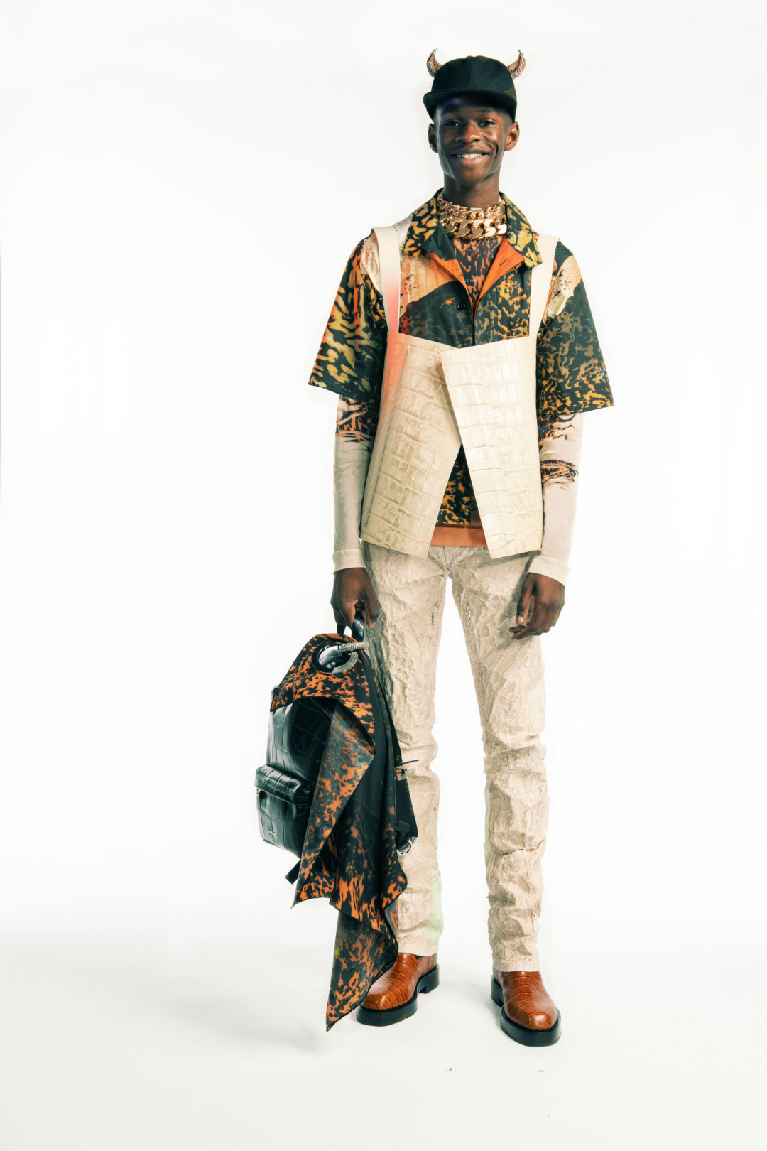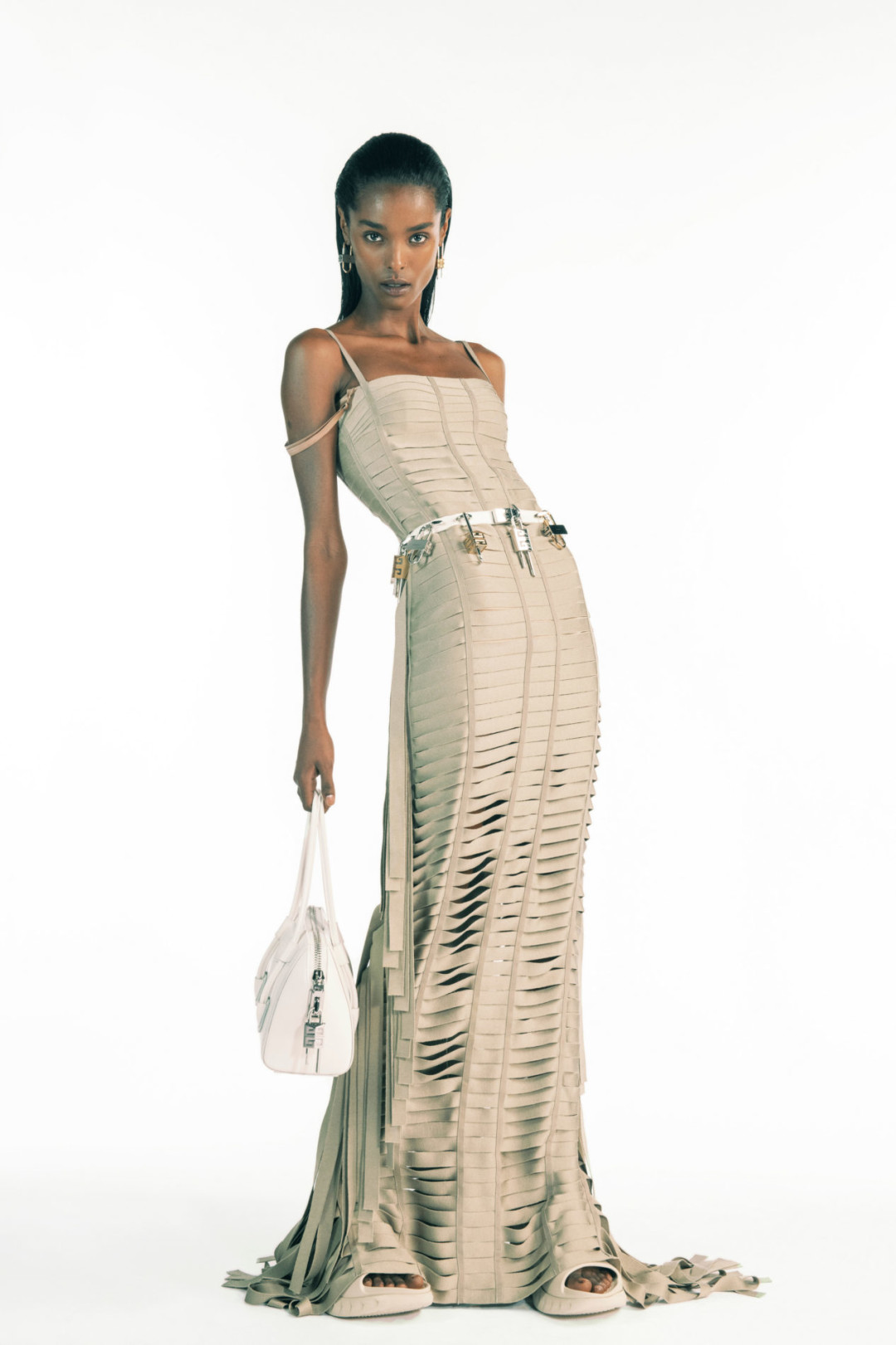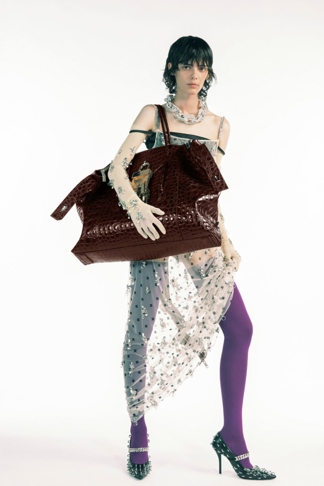 Дополняли образы аксессуары: головные уборы с рогами, огромные сумки. Также Givenchy показали босоножки с двумя перемычками между пальцами. Цветовая палитра состоит из базовых белого и черного оттенков, красного, фиолетового, бежевого и шоколадного. Презентация новой коллекции прошла в формате stories в инстаграм-аккаунте бренда.