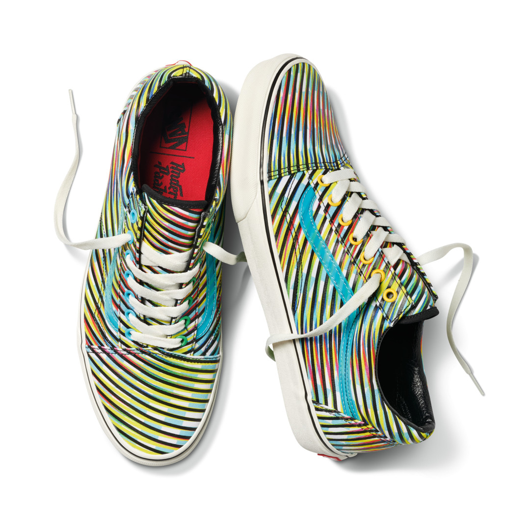 В коллаборацию вошли кеды Old Skool DX с психоделическим паттерном, digital-принтом и 3D-печатью. Модель украшена желтыми петельками и переливающимися Sidestripe голубого цвета. Верх кроссовок Sid DX выполнен из ткани шенилл, модель отличается разноцветными шнурками и контрастной строчкой. Кроме того, у Sid DX кастомная этикетка, полупрозрачная зеленая подошва и особая упаковка с пыльником в комплекте. Аксессуары коллекции представлены панамами с двумя видами принтов, силиконовыми нашивками и цитатами песен Андерсона Пака.