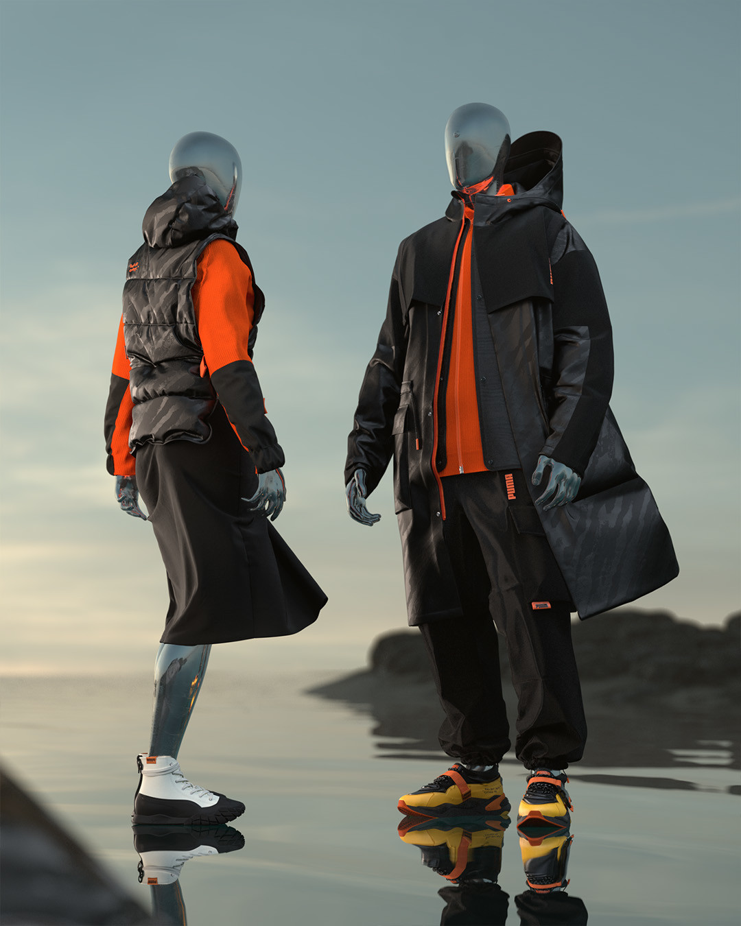 В мужскую и женскую линейки PUMA x CSM вошли двойная куртка (длинная зимняя снаружи и мягкая короткая внутри), свитер из переработанных материалов, окрашенных по технологии Dope Dye, худи с трехмерным передним карманом с застежкой на кнопке, двумя потайными молниями на воротнике и регулируемой тесьмой с пряжкой с обеих сторон, ярко-желтая сумка с клапаном и застежкой на липучке, рюкзак с отделениями для ноутбука и боковыми сетчатыми карманами.