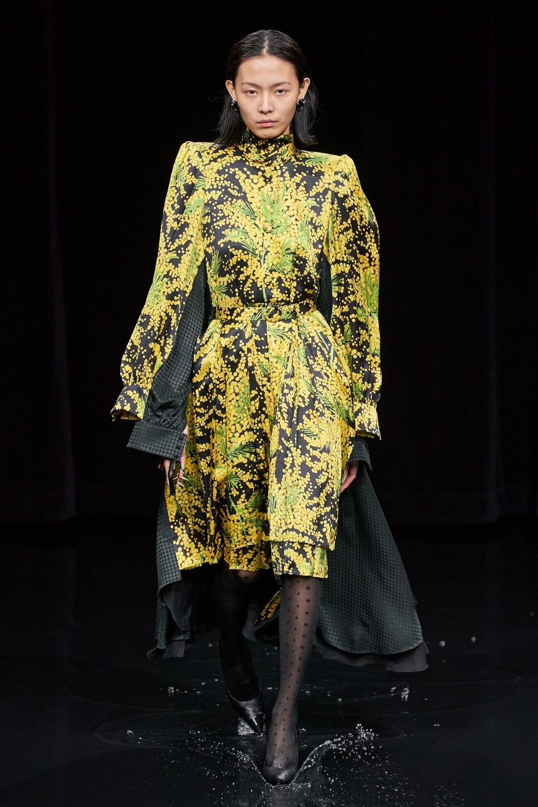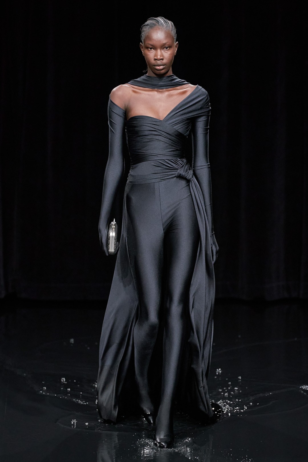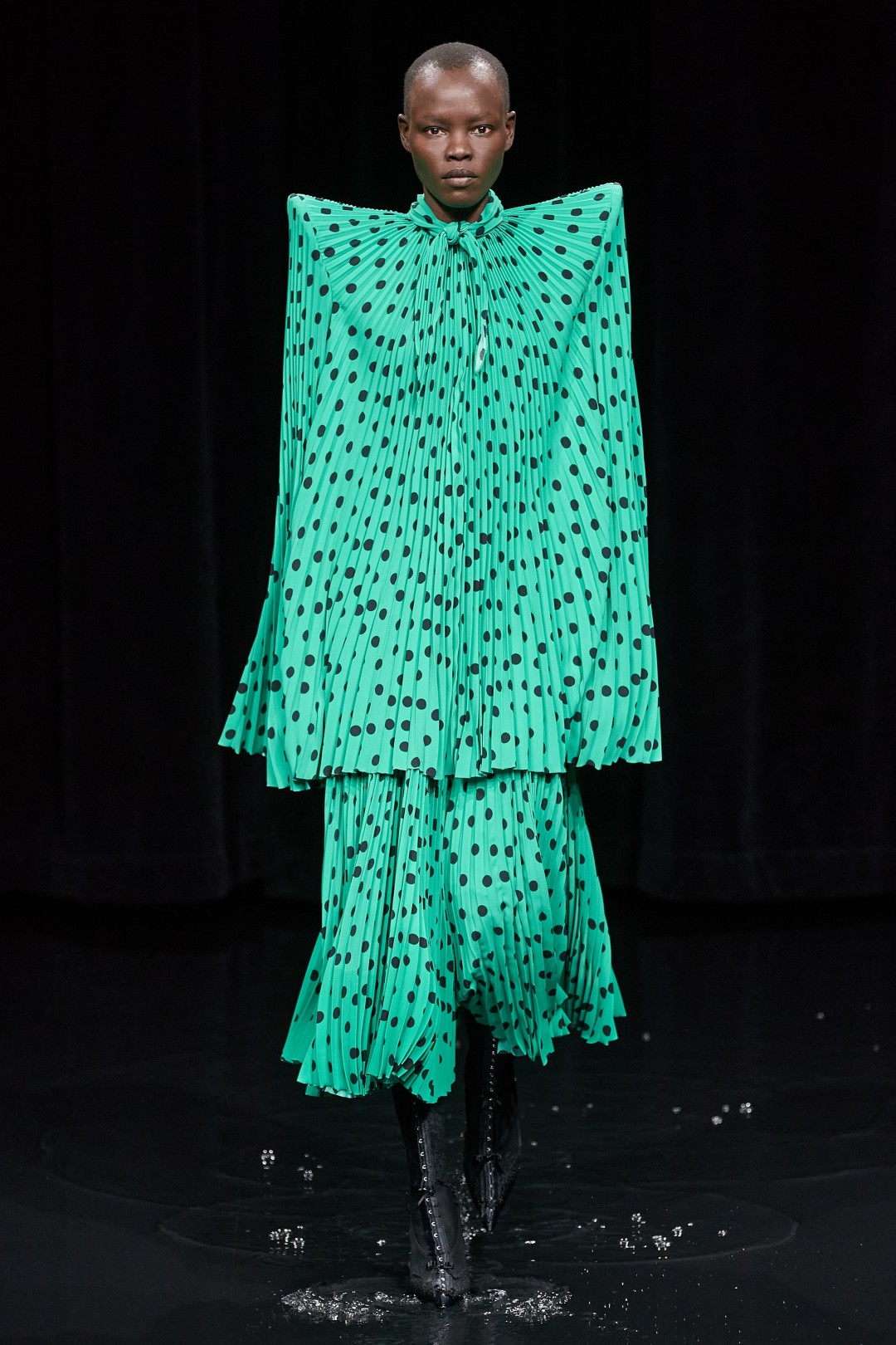 В коллекцию вошли пальто, жакет, пуловер с гипертрофированными монструозными плечами, объемные платья со оборками и шлейфом, удлиненные блузы свободного кроя, шерстяные и кожаные облегающие юбки, облегающие топы и леггисы, которые Демна Гвасалия рекомендует носить с огромным шлейфом, серьги и кулоны в виде замков, флуоресцентные ботфорты (о которых мы уже рассказывали).