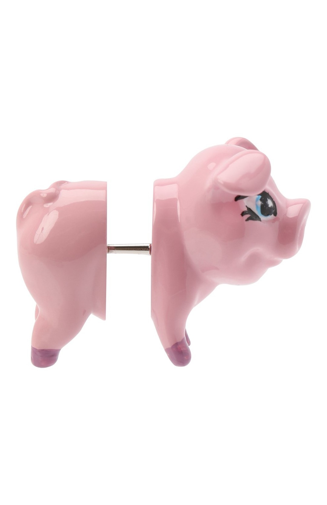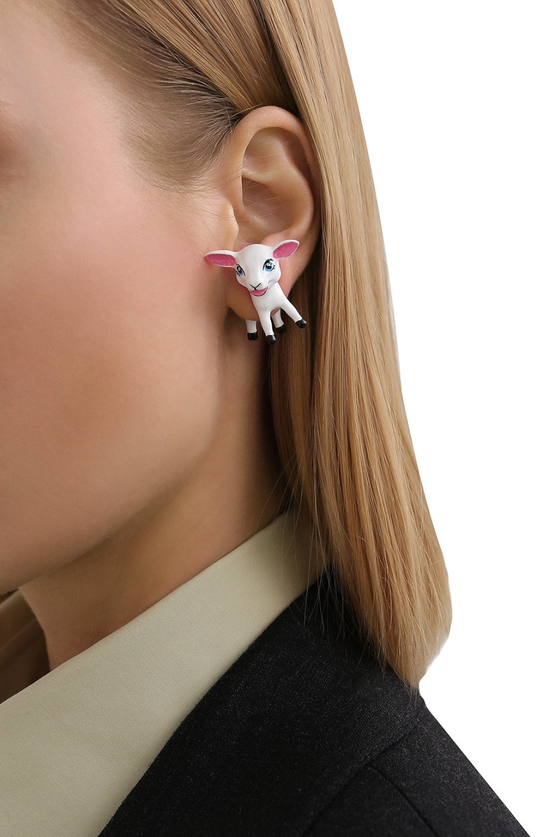 Украшения в форме свинки и овечки выполнены из латуни и алюминия и покрыты эмалью. Несмотря на то, что выглядят они как вполне себе весомые, на самом деле серьги миниатюрные — весом всего 13 грамм. Они вошли в подиумную осенне-зимнюю коллекцию Balenciaga.