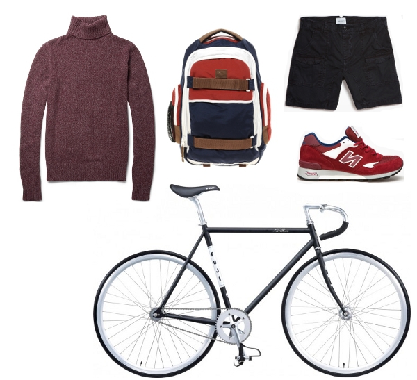 Кроссовки New Balance, 7 900 руб; кашемировый свитер Loro Piano, mrporter.com, 31 000 руб; рюкзак Vans, asos.com, 2 700 руб; шорты Norse Projects, fott.ru, 5 300 руб; велосипед Fuji.