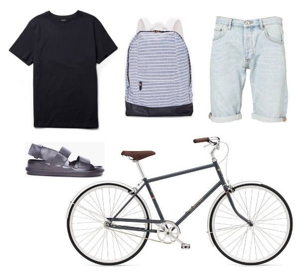 Футболка Topman, 799 руб; шорты Topman, 1 999 руб; рюкзак Rag&Bone, ssense.com, 8 600 руб; сандалии Givenchy, магазин DayNight Shoes, 15 800 руб; велосипед Electra.