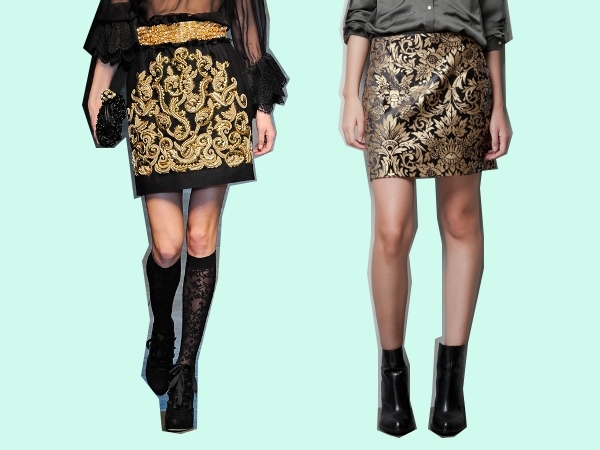 Dolce & Gabbana свою зимнюю коллекцию полностью посвятили барокко: черные юбки и платья расшиты золотыми нитями. На малобюджетных копиях барочную вышивку заменяет принт.