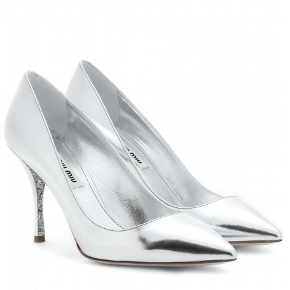 Серебряные лодочки Miu Miu с подошвой, усыпанной блестками.