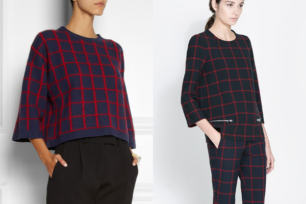Мохеровый свитер Miu Miu в клетку скопировали дизайнеры Zara. Хоть копия выполнена из шерсти и полиэстера, зато есть карманы и брюки в комплекте.