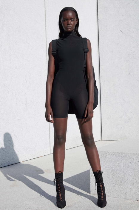 В ассортименте — привычный набор Yeezy, но теперь без мужских вещей: боди, сливающиеся с кожей платья, комбинезоны, которые сравнивают с колготками, дубленки, пуховики и велосипедки. В обувной линейке — ботфорты, которые в новом сезоне могут заменять штаны.
