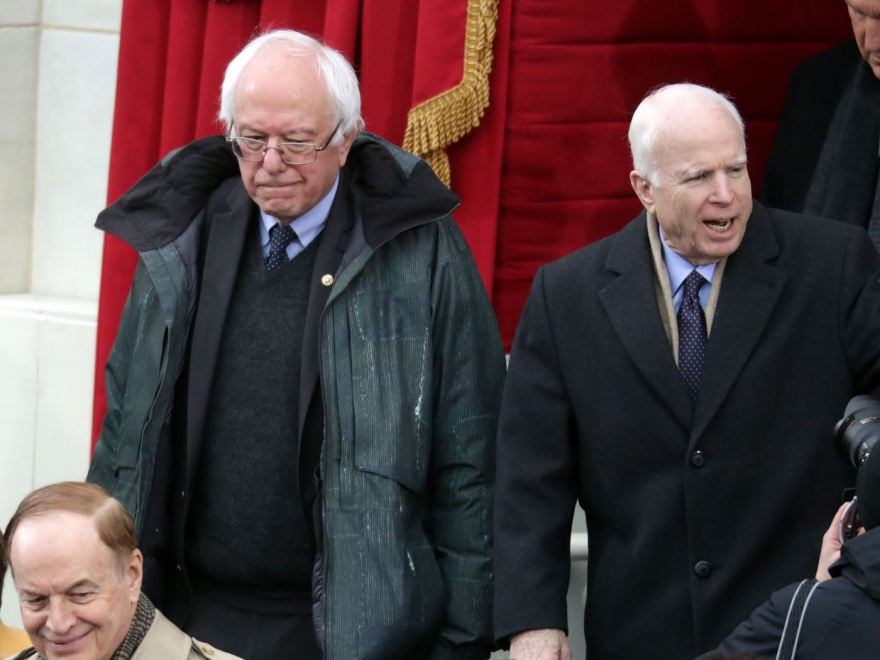 Берни Сандерс — еще и best-dressed-герой инаугурации Трампа, которая прошла в пятницу. В толпе черных пальто и пиджаков демократ выделялся своей зеленой блестящей паркой. Это обычная модель сноубордистского бренда Burton, которую можно купить даже в России.