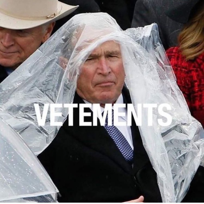 И напоследок: самую нелепую ситуацию — например, дождевик Буша на инаугурации Трампа — всегда можно прикрыть логотипом Vetements и выглядеть актуально.