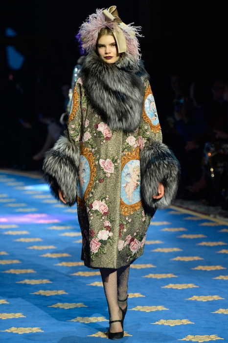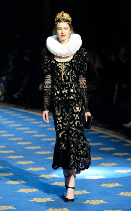 Наряды из коллекции будто бы вышли из этой театральной мастерской: полсотни расшитых бисером и золотой нитью пальто, бархатные платья, гигантские жабо воспевают работу костюмеров, портных и вышивальщиц миланского театра.