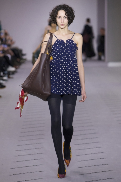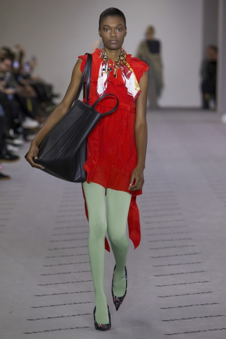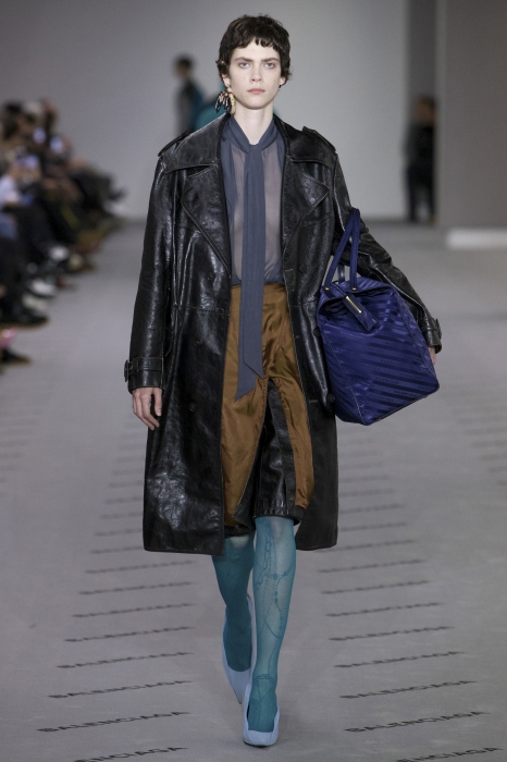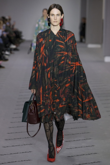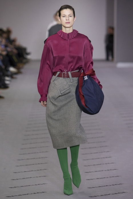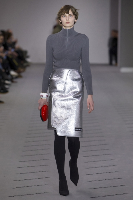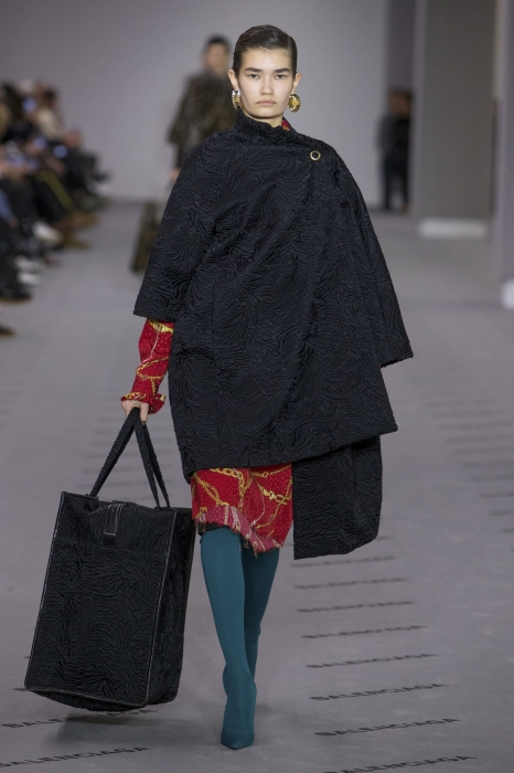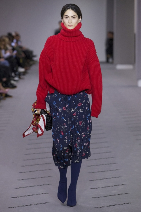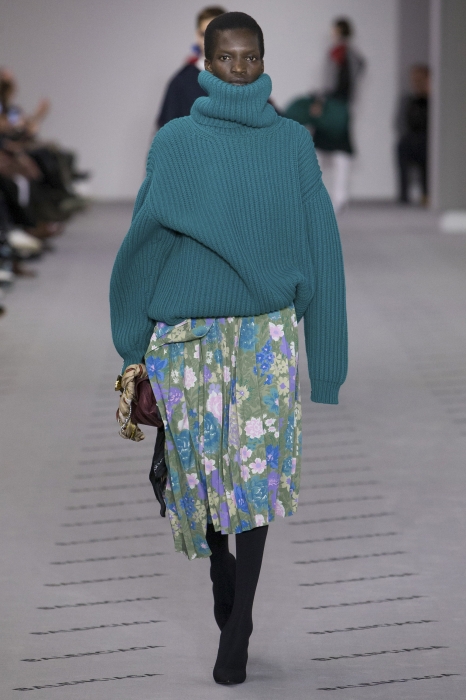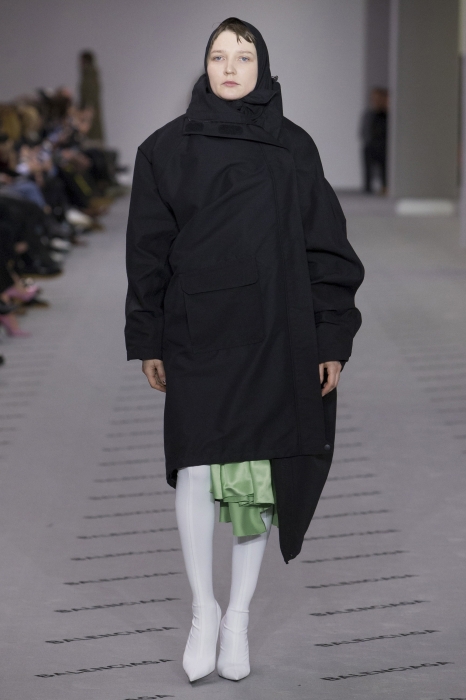 Но как бы Демну не увлекали архивы Balenciaga, дизайнер остался верен себе: к вечерним платьям — гигантские сумки челнока, к миди-юбкам — ботфорты-леггинсы, а к пуховикам — пристегивающиеся косынки.