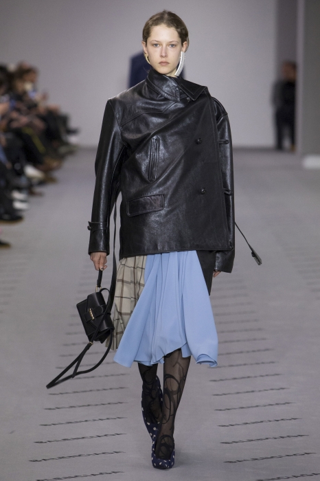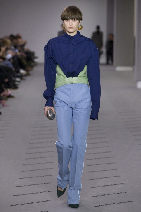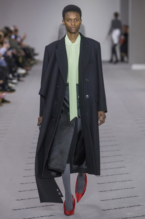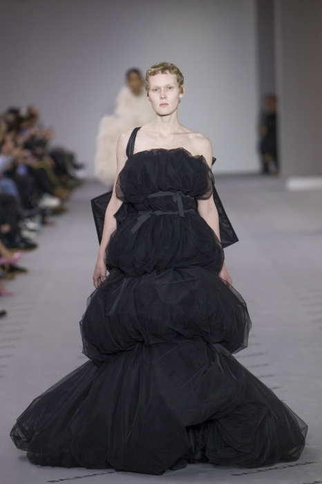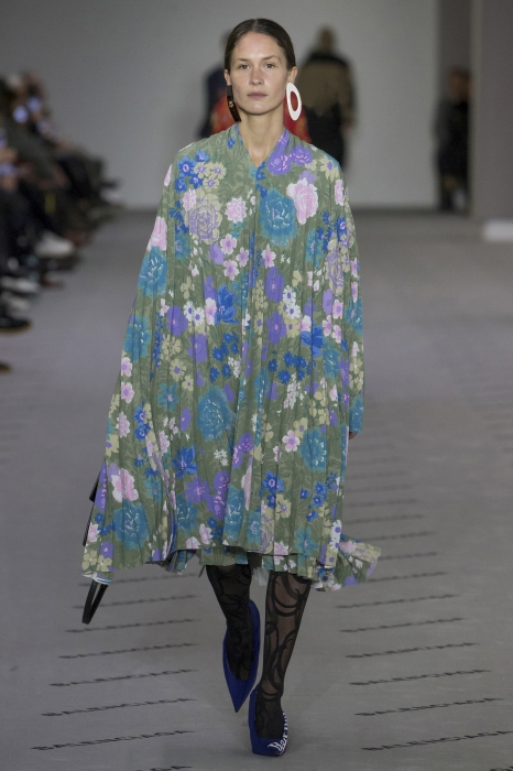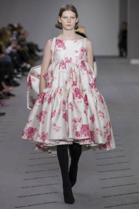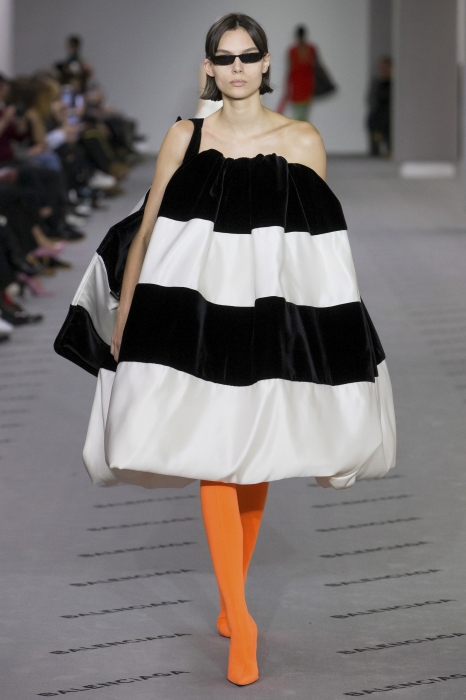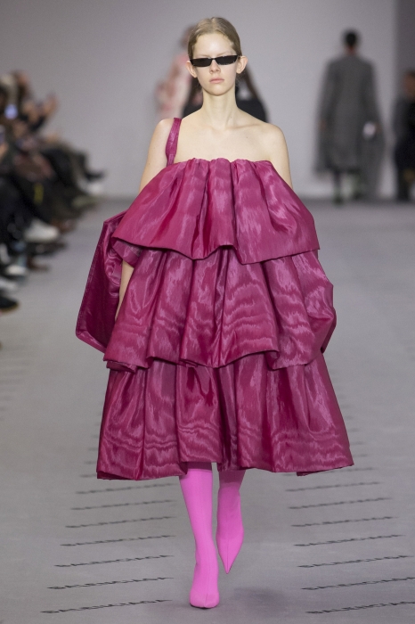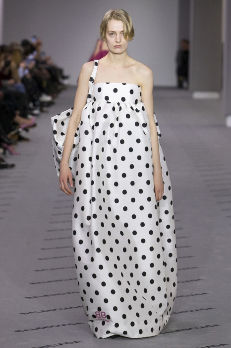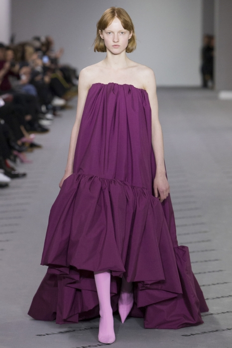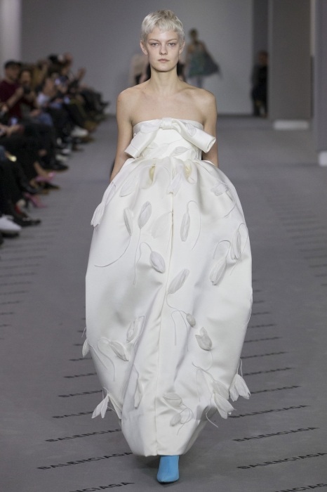 Устав от образов постсоветских гопников, Демна Гвасалия заинтересовался архивами модного дома. На показе в Париже мы увидели силуэты, близкие к работам Кристобаля Баленсиаги, смещенные влево застежки почти что на всей верхней одежде и — наконец-то! — вечерние платья.